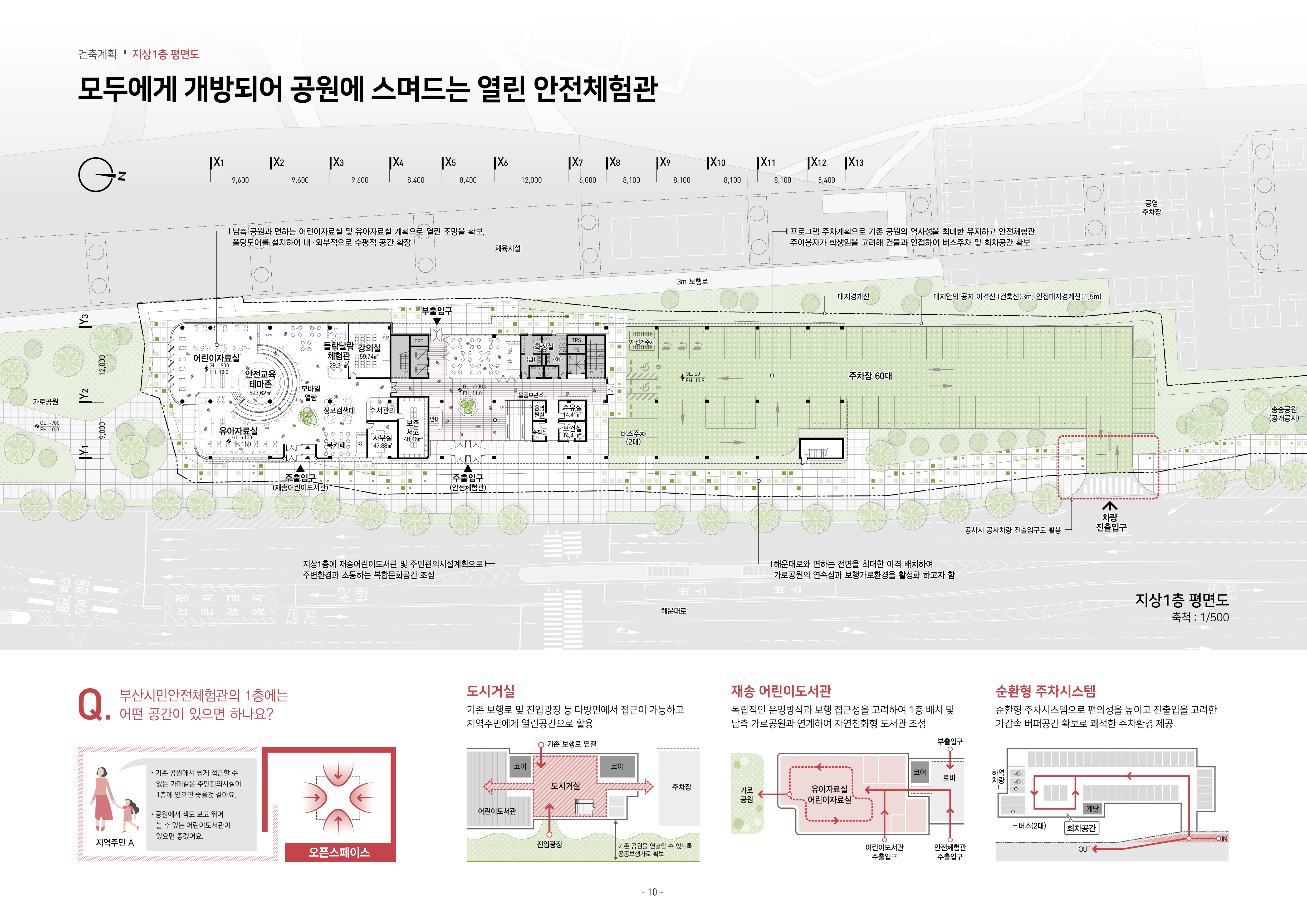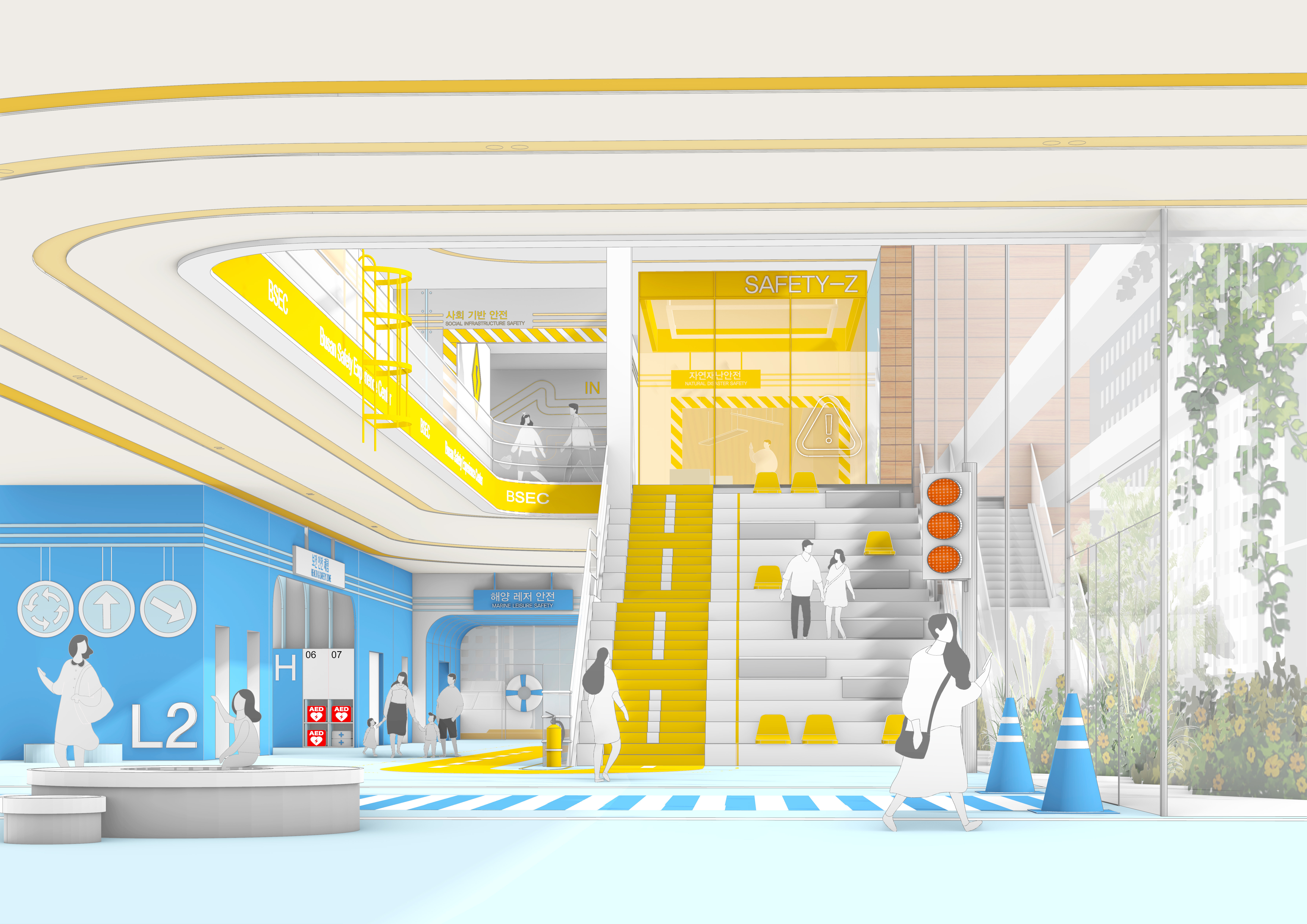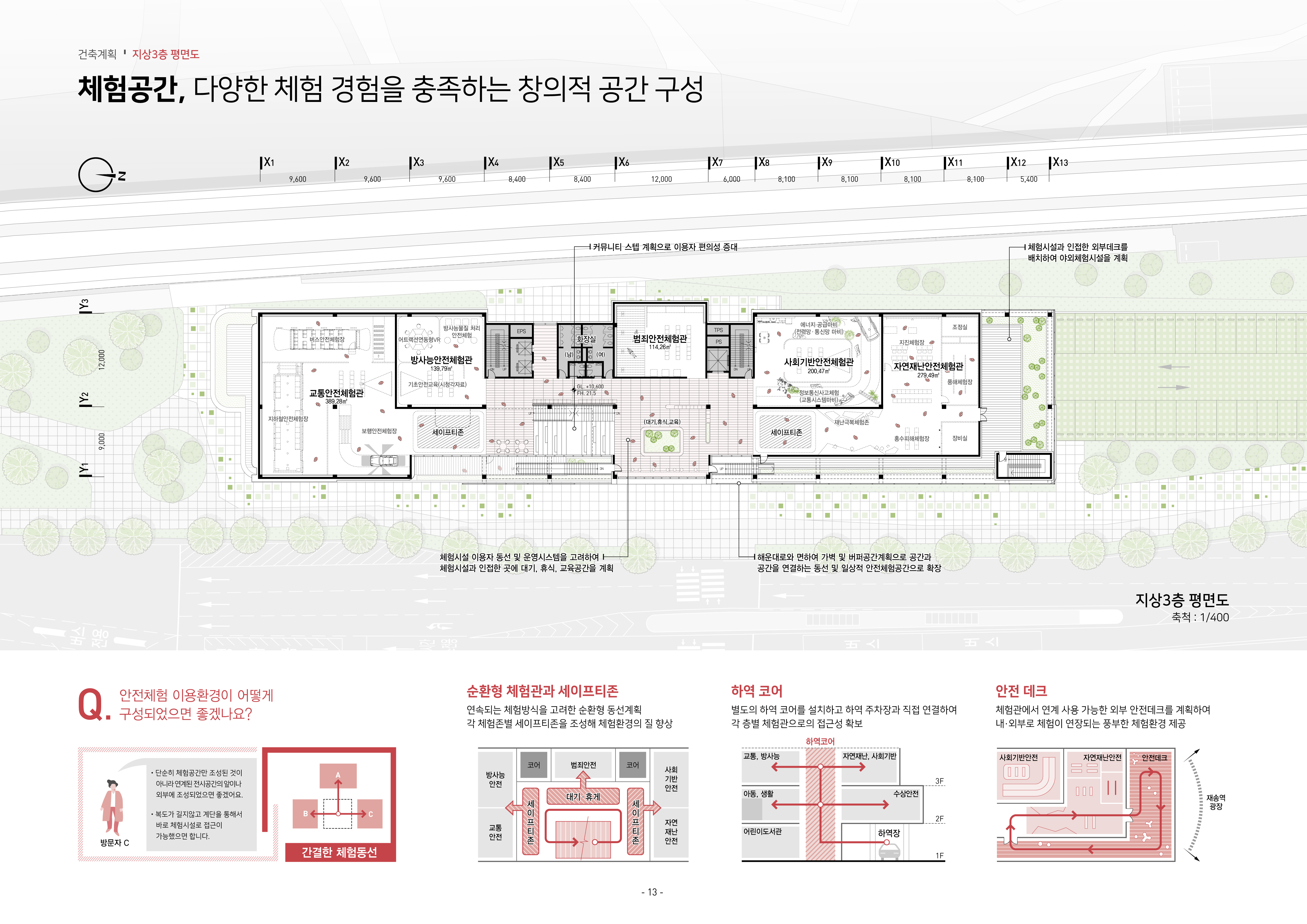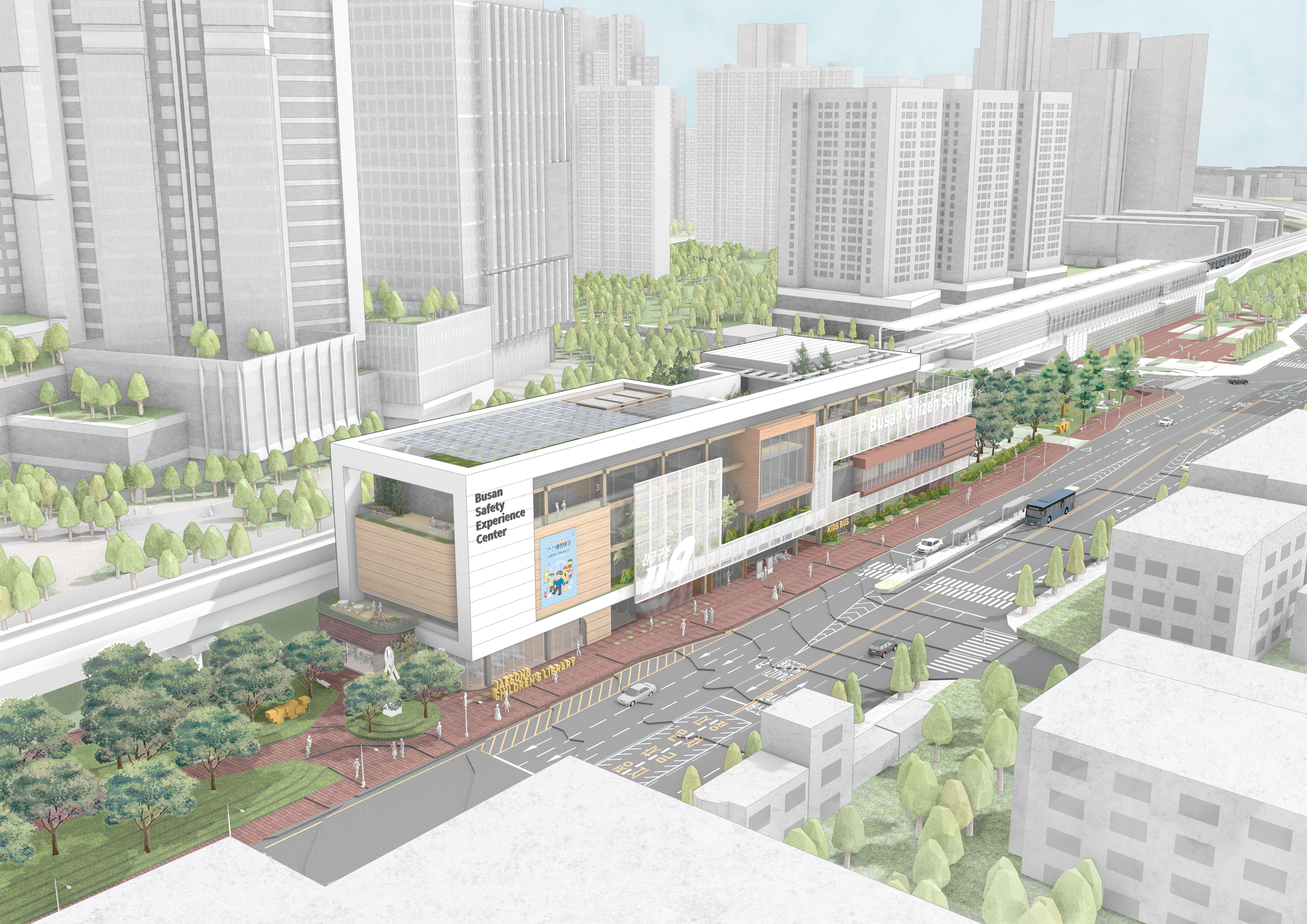 도시의 완충공간으로써 산책과 휴식등 지역주민들의 일상이 담긴 가로공원에 안전체험관이 자리하게 됩니다. 1층에는 공원의 자연을 가까이서 느낄 수있는 어린이도서관과 누구나 자유롭게 오가며 유연하게 활용 할 수있는 주민편의 시설을 조성하여 공원과 같은 개방적인 장소가 되고자 합니다. 2층과 3층은 어린이, 생활, 재난, 안전체험존으로 모두가 이용하는 체험공간입니다. 어린이들이 주로 체험하는 시설은 2층에, 재난 규모가 큰 체험실은 3층에 그룹핑하여 운영프로그램에 따라 연계되는 체험프로그램 간 이동 동선을 최소화하였습니다. 체험과 휴식을 반복하는 안전체험관의 운영방식은 충분한 대기공간을 필요로 합니다. 체험프로그램 중심에 위치한 커뮤니티공간은 대기, 휴식, 오리엔테이션 등 다양한 활동을 담은 공간입니다. 층별로 조성된 커뮤니티 공간은 다목적 계단으로 연결되고 외부테라스와 천창으로 빛과 바람이 스며들어 다양한 활동이 입체적으로 도시에 드러나는 공간입니다. 공원과 가로에서는 어린이들의 웃음소리와 주민들의 도란도란 담소가 들리며 입체적이고 쾌적한 환경속에서 안전체험이 도시의 일상에 스며드는 부산국민안전체험관이 되고자 합니다.
