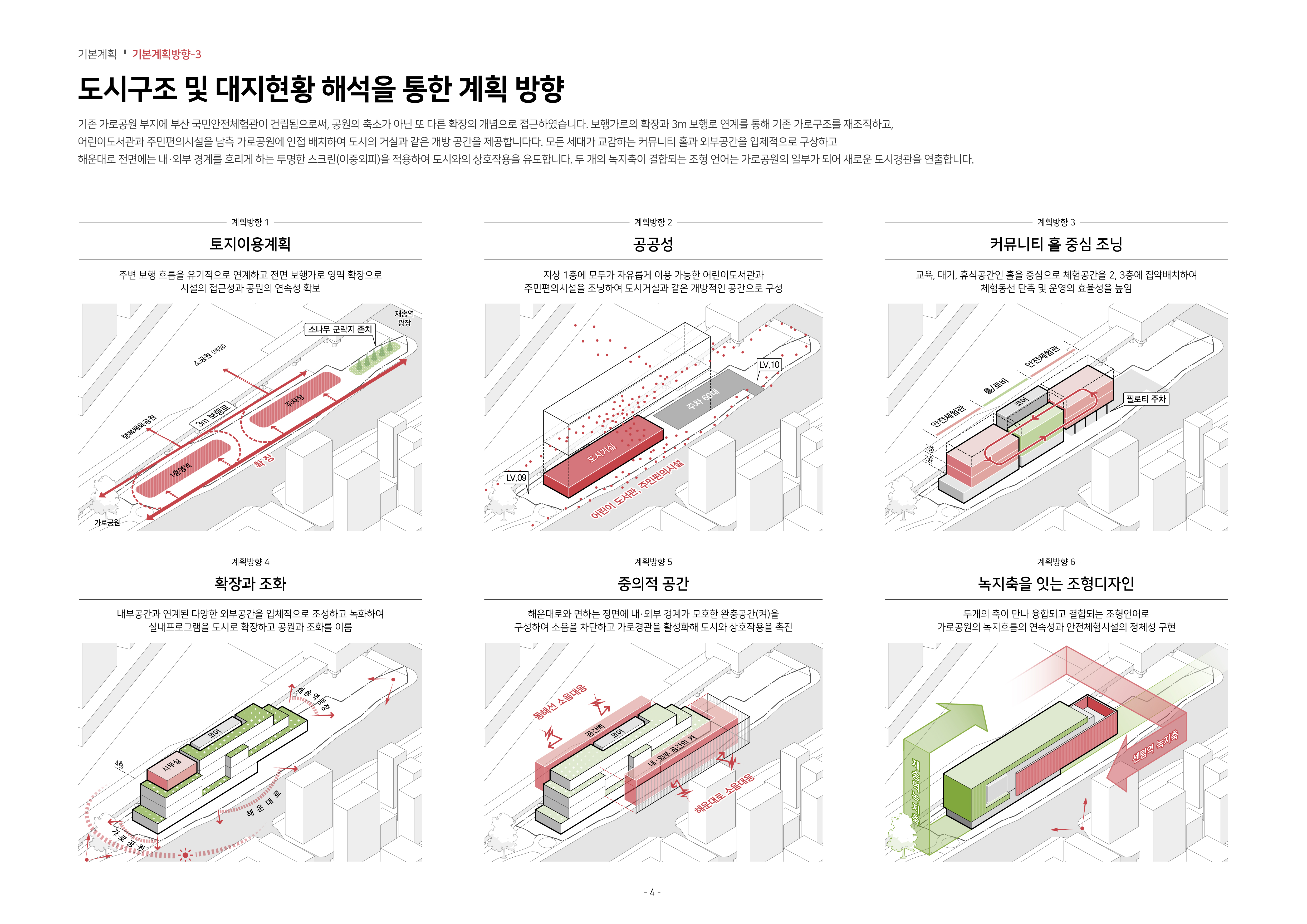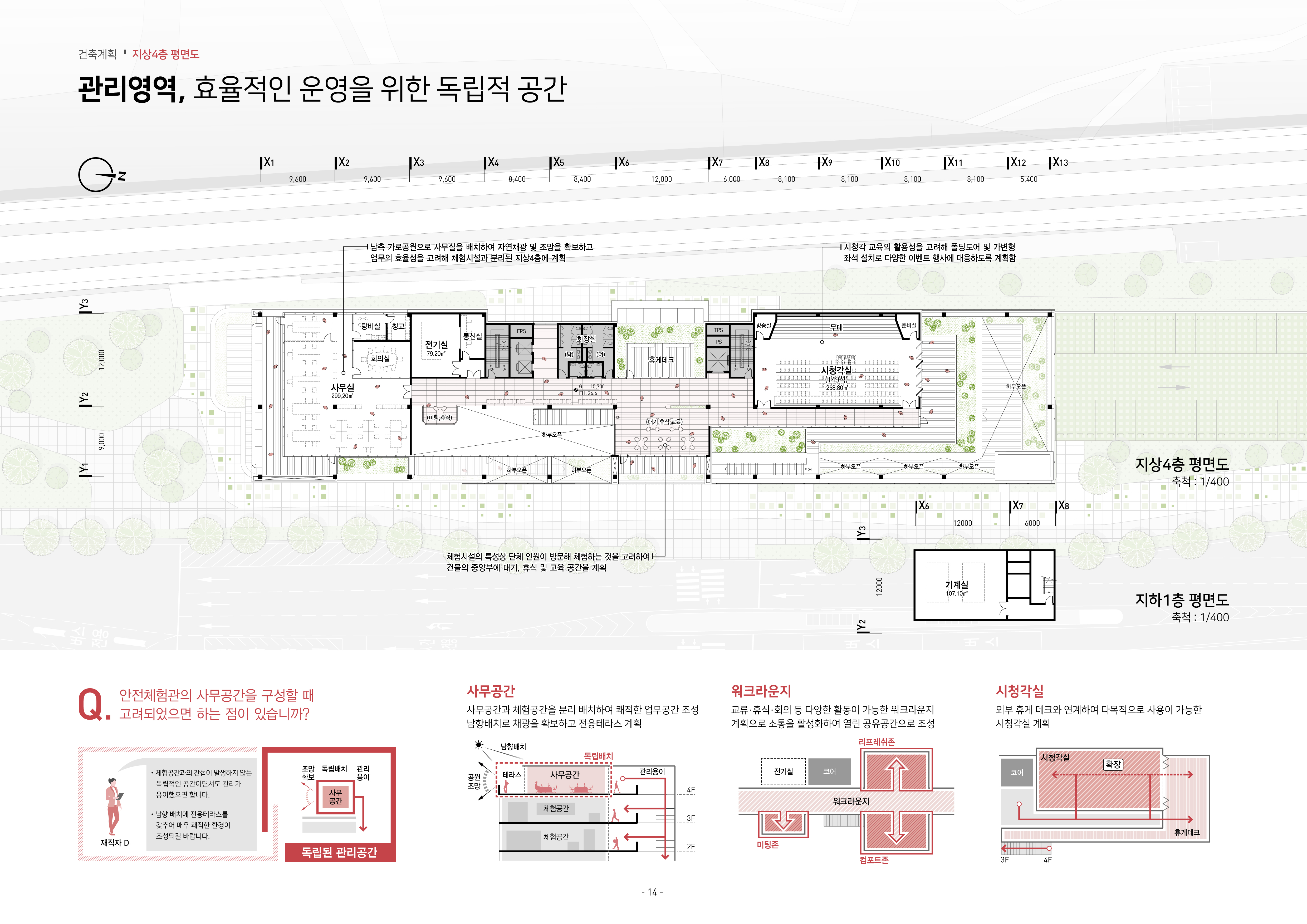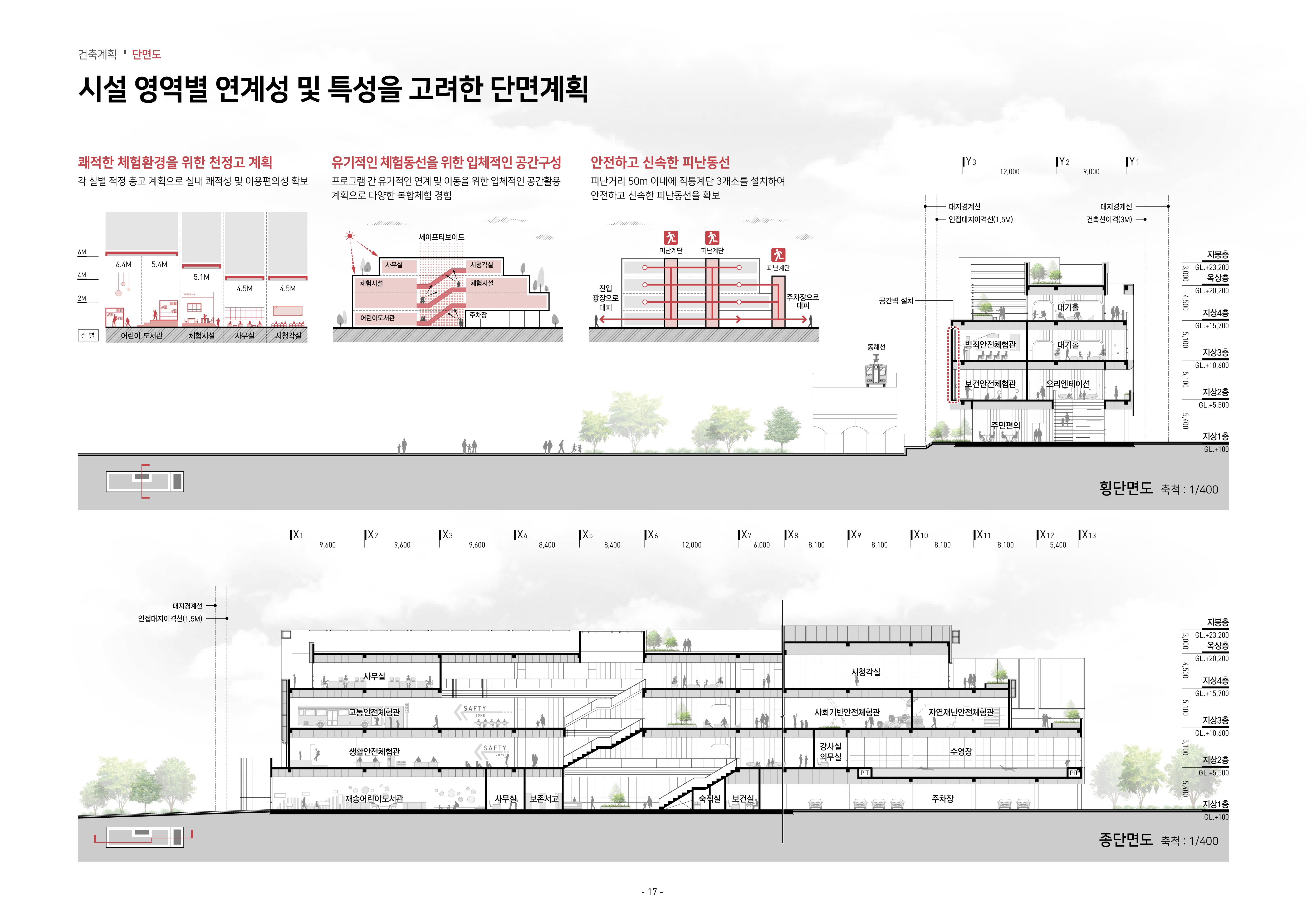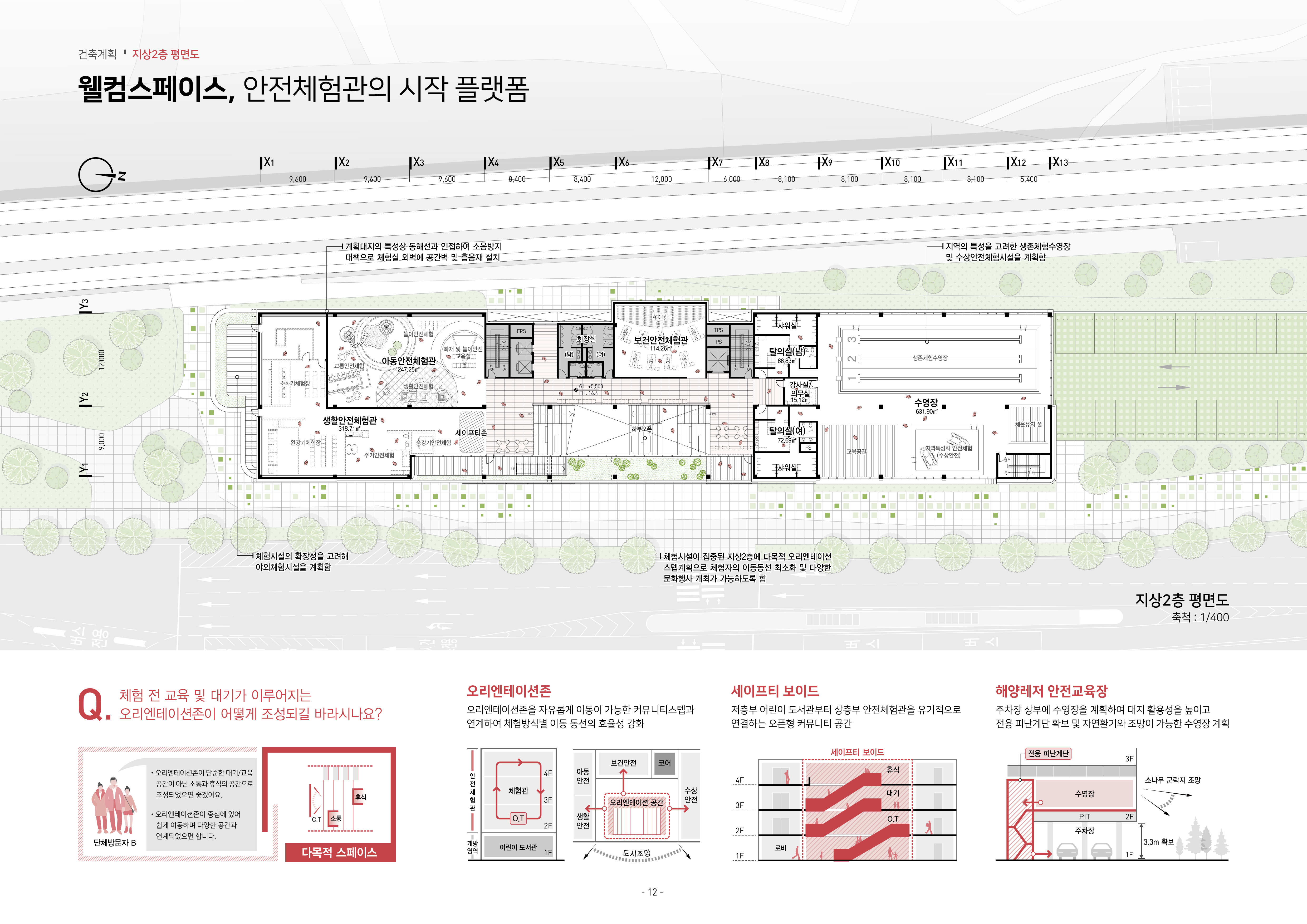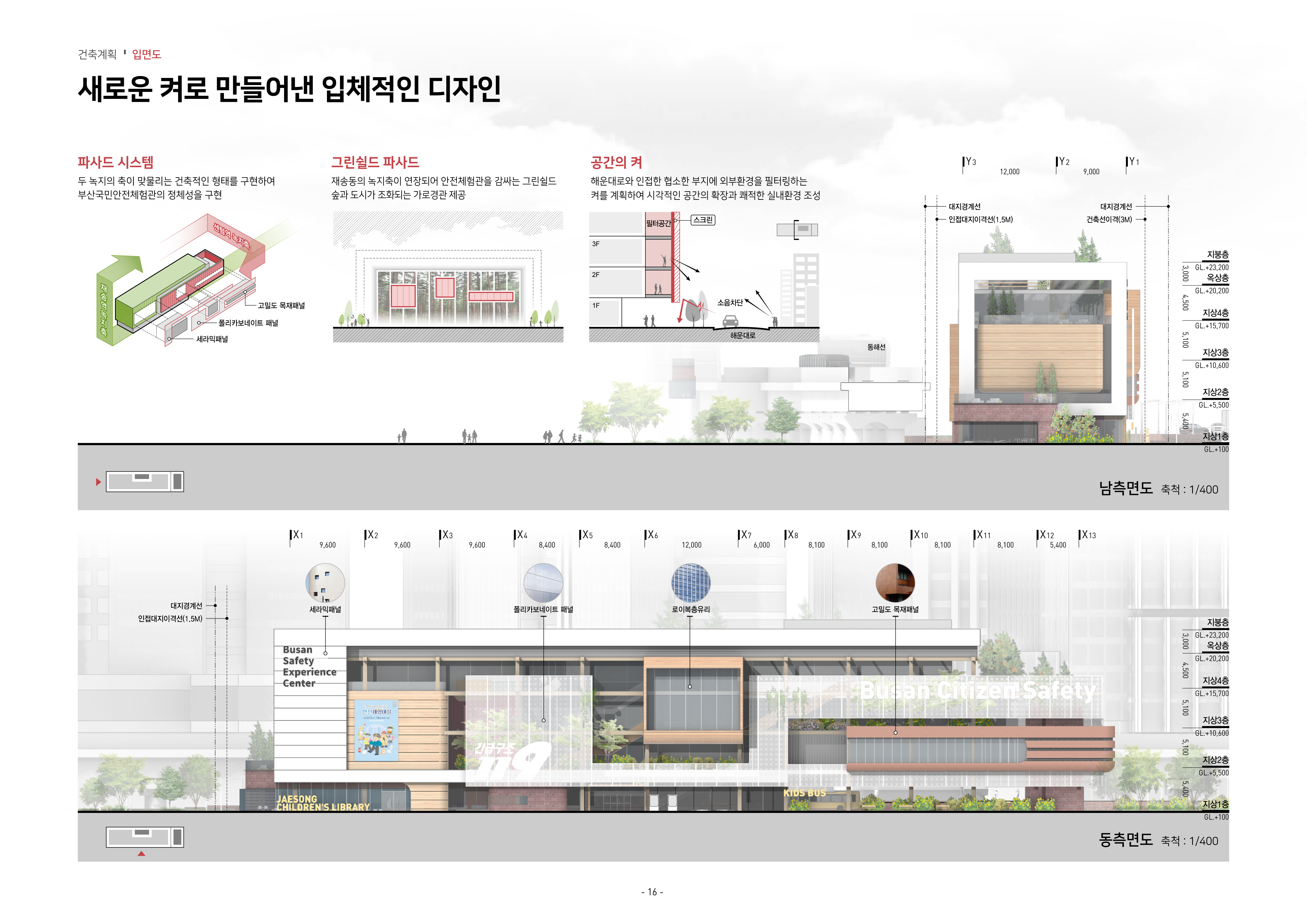 도시의 완충공간으로써 산책과 휴식등 지역주민들의 일상이 담긴 가로공원에 안전체험관이 자리하게 됩니다. 1층에는 공원의 자연을 가까이서 느낄 수있는 어린이도서관과 누구나 자유롭게 오가며 유연하게 활용 할 수있는 주민편의 시설을 조성하여 공원과 같은 개방적인 장소가 되고자 합니다. 2층과 3층은 어린이, 생활, 재난, 안전체험존으로 모두가 이용하는 체험공간입니다. 어린이들이 주로 체험하는 시설은 2층에, 재난 규모가 큰 체험실은 3층에 그룹핑하여 운영프로그램에 따라 연계되는 체험프로그램 간 이동 동선을 최소화하였습니다. 체험과 휴식을 반복하는 안전체험관의 운영방식은 충분한 대기공간을 필요로 합니다. 체험프로그램 중심에 위치한 커뮤니티공간은 대기, 휴식, 오리엔테이션 등 다양한 활동을 담은 공간입니다. 층별로 조성된 커뮤니티 공간은 다목적 계단으로 연결되고 외부테라스와 천창으로 빛과 바람이 스며들어 다양한 활동이 입체적으로 도시에 드러나는 공간입니다. 공원과 가로에서는 어린이들의 웃음소리와 주민들의 도란도란 담소가 들리며 입체적이고 쾌적한 환경속에서 안전체험이 도시의 일상에 스며드는 부산국민안전체험관이 되고자 합니다.