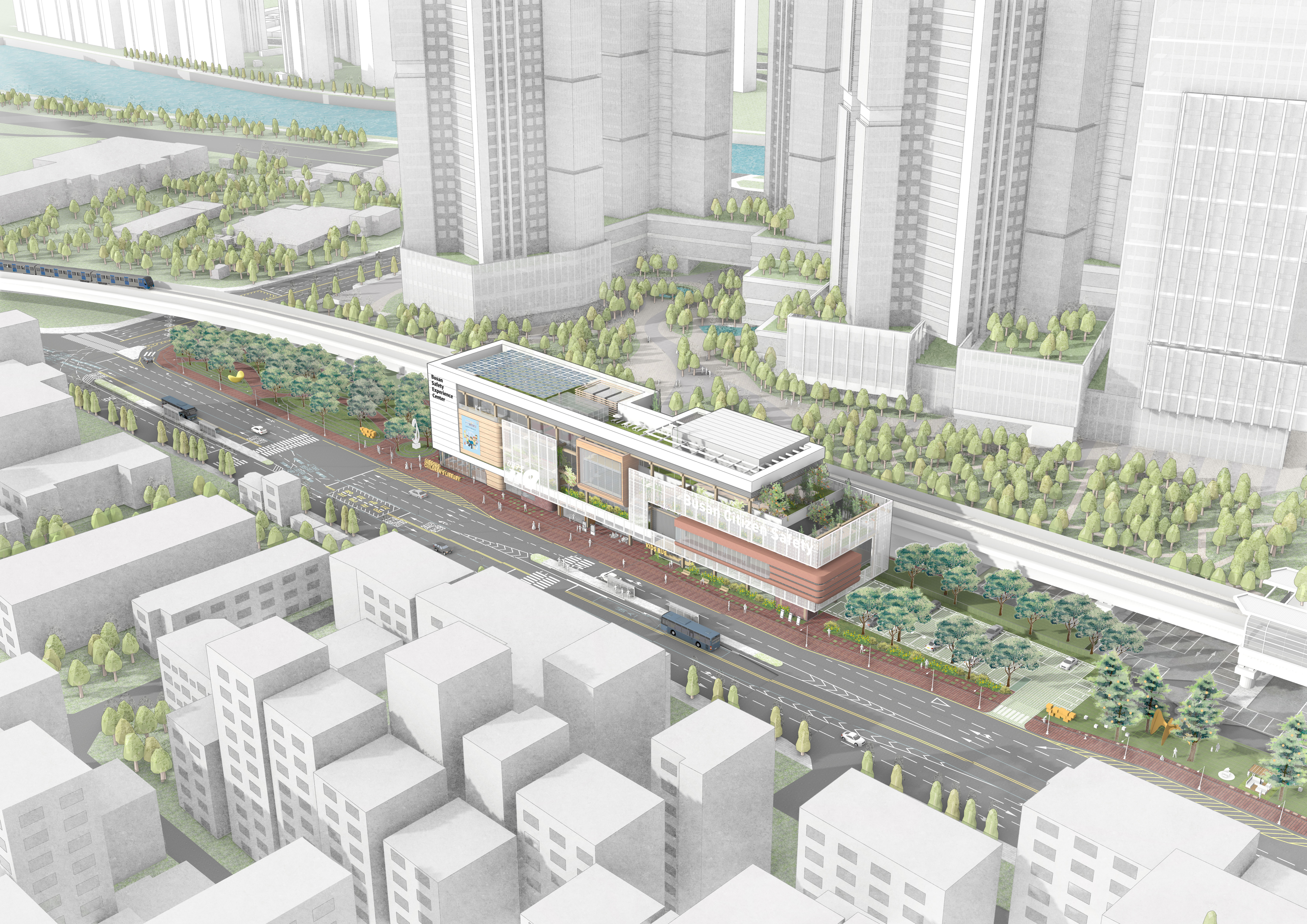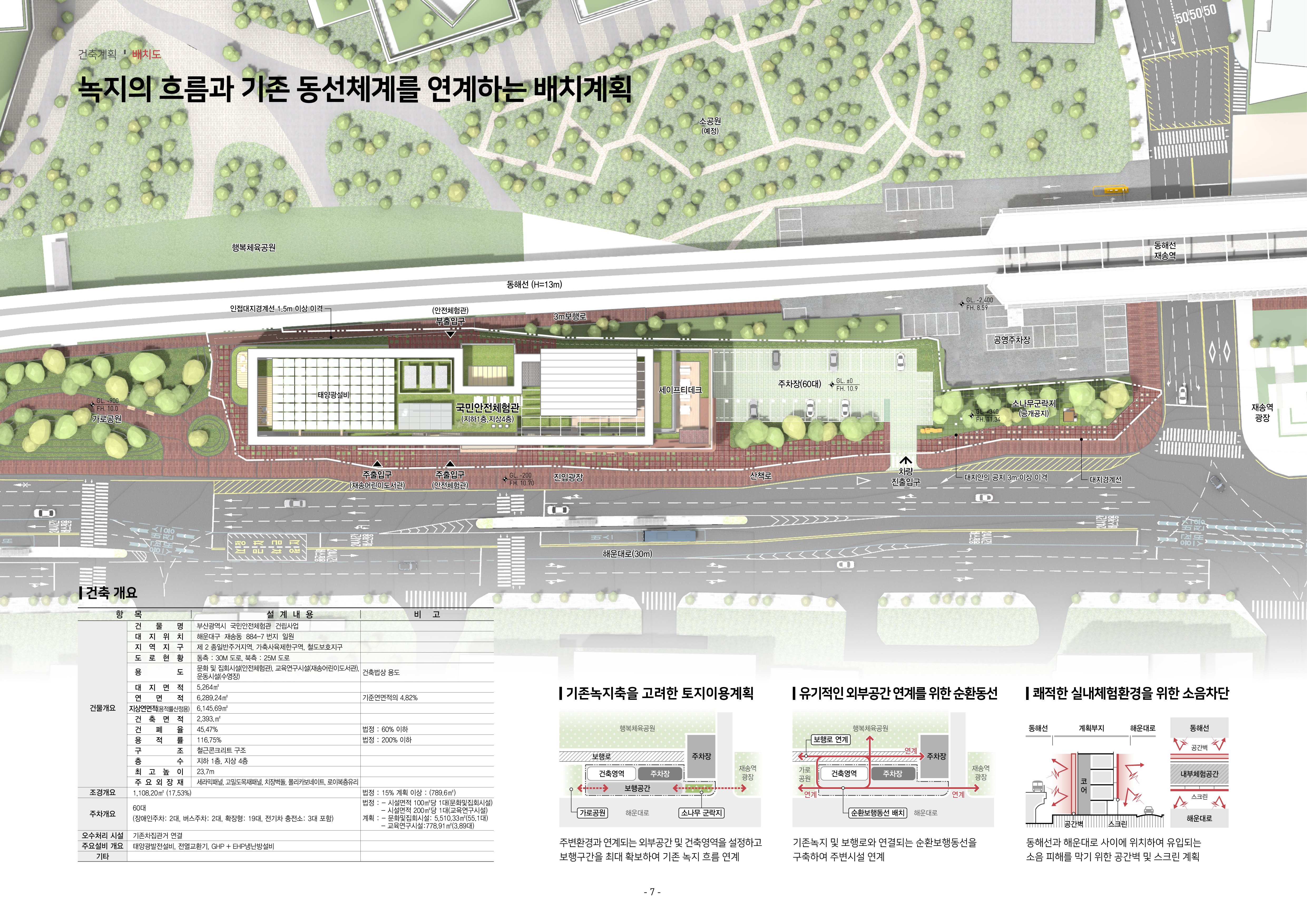 북쪽의 소나무 군락지를 조성하여 재송역 광장과 연계하고 남쪽의 기존 가로공원과 자연스러운 흐름을 만들어내고 있습니다. 또한 내부 홀을 중심으로 체험실을 배치하여 인지성을 높이고 연속적인 체험이 가능하도록 효율적인 동선 체계를 구성하는 등 기능 및 평면 조닝에서도 완성도가 높습니다.