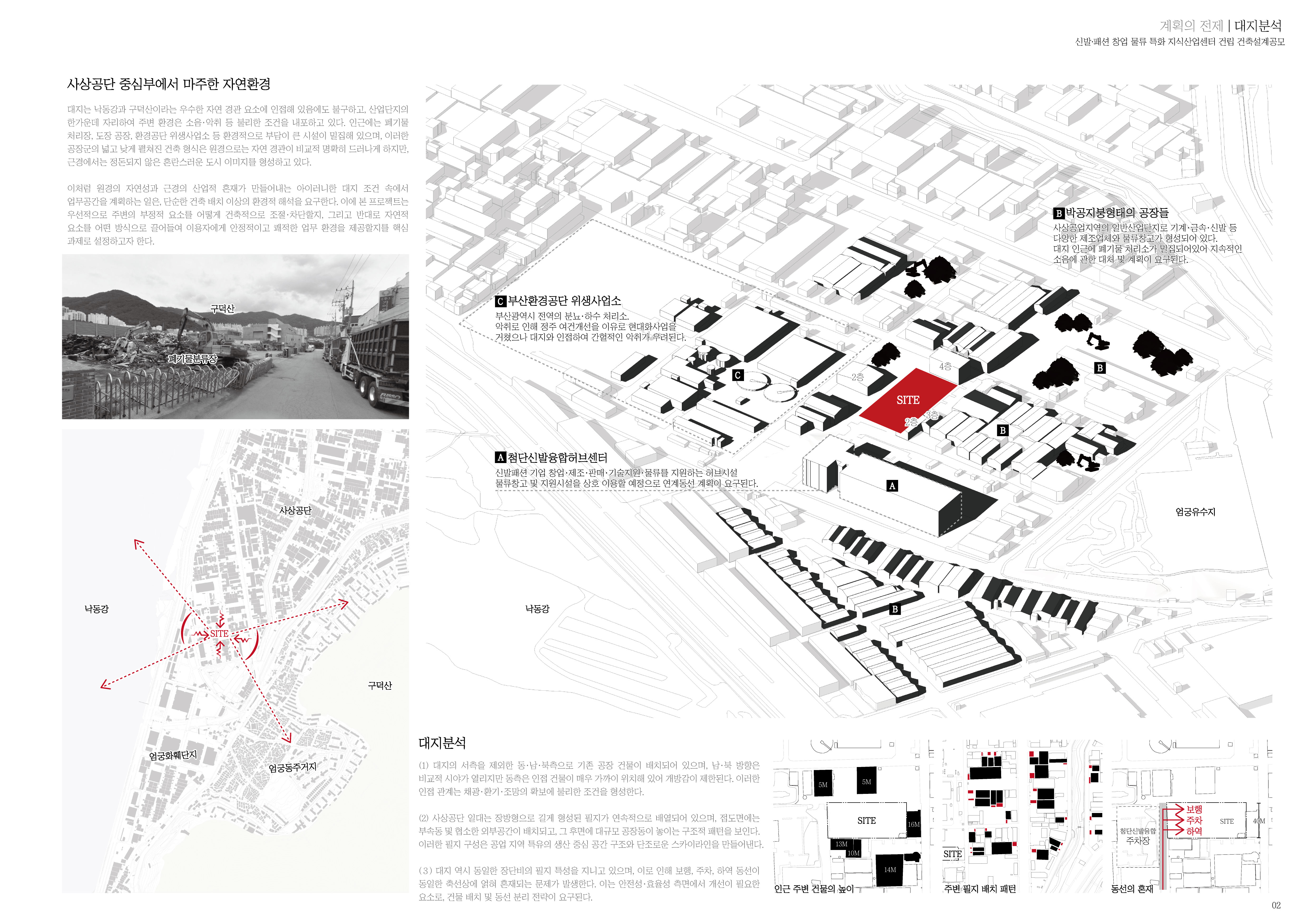 보행동선과 차량동선의 설정이 허브센터와 연계를 고려한 유기적 흐름을 만들며, 전면부에 배치한 물류 처리 공간과 허브센터 방향으로 확보한 개방감있는 공간의 기능성과 소통성을 동시에 확보하고 있는 점이 돋보입니다. 공단지역의 맥락을 재해석하고, 은유적으로 이해하려 한 점 또한 인상적으로 보입니다.