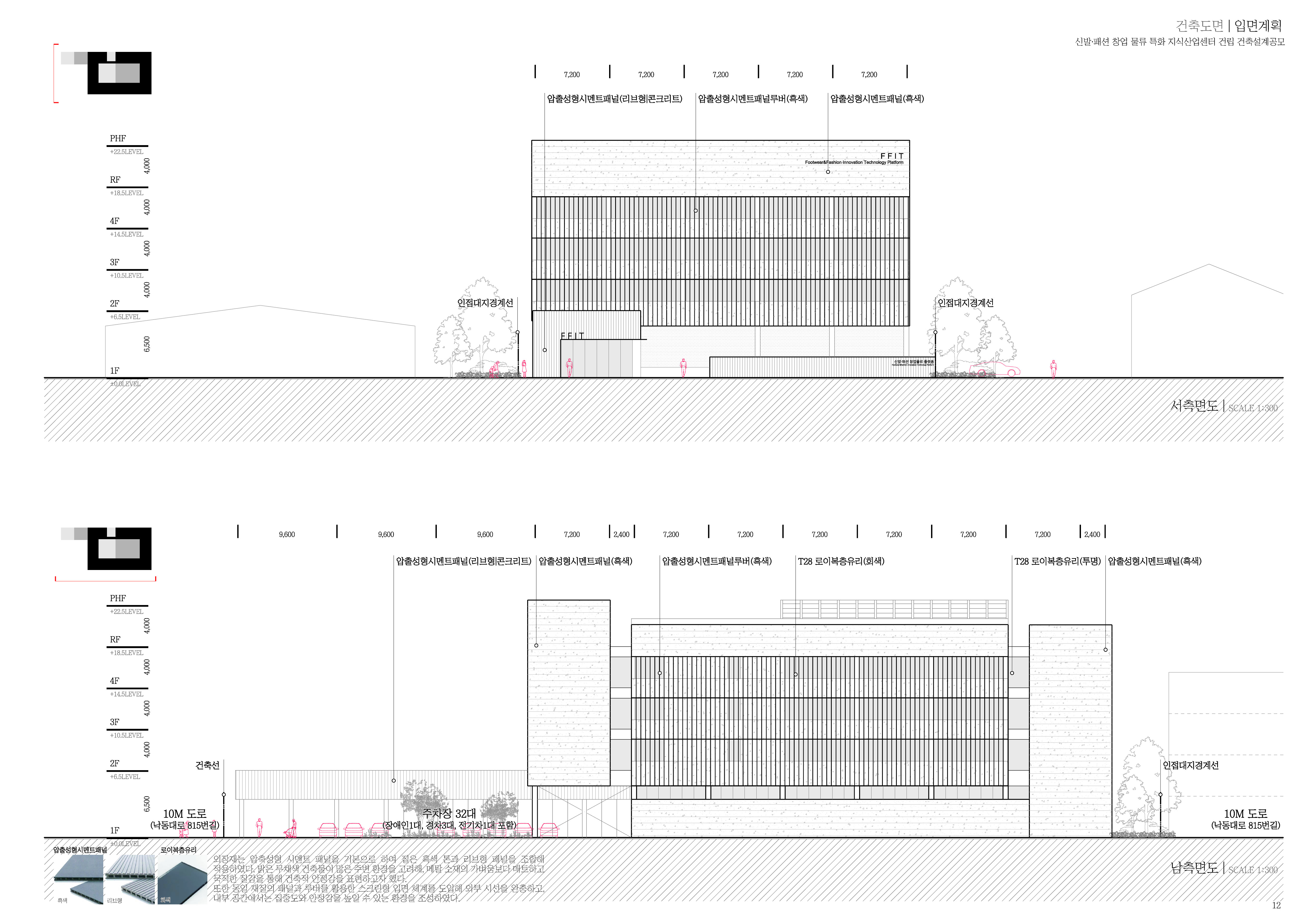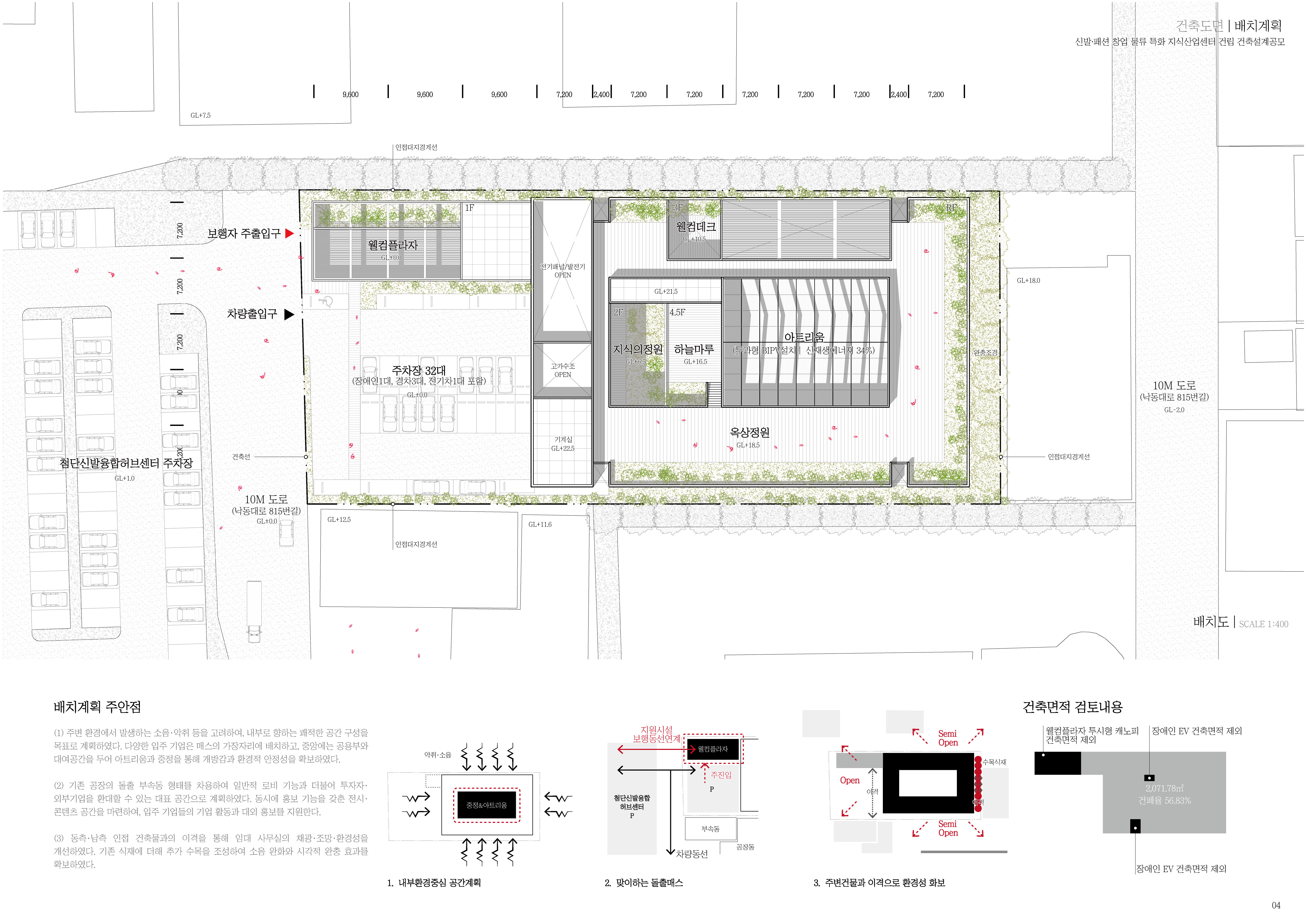 01 아트리움의 공간이 신발·패션 창업 인큐베이터의 역활을 충분히 담을 수 있는 작품으로 가장 창의적 계획으로 읽혀짐. 02 허브센터와의 직접적 동선 연결, 주차장의 전면배치는 허브센터의 주차장과 하나되는 주차장을 읽혀짐, 따라서 허브센터와 지원센터를 하나로 보고 배치계획이 이루어졌다 판단됨. 03 아트리공간의 소음, 보안, 에너지 등의 이슈가 남아 있지만 배치와 평면 합리성, 주변 환경과 공장들의 맥락적 해석과 분석, 특히 4층의 규모는 지원센터의 기능과 합리적 공사비 등에서 많은 이점이 있을 것으로 판단됨.