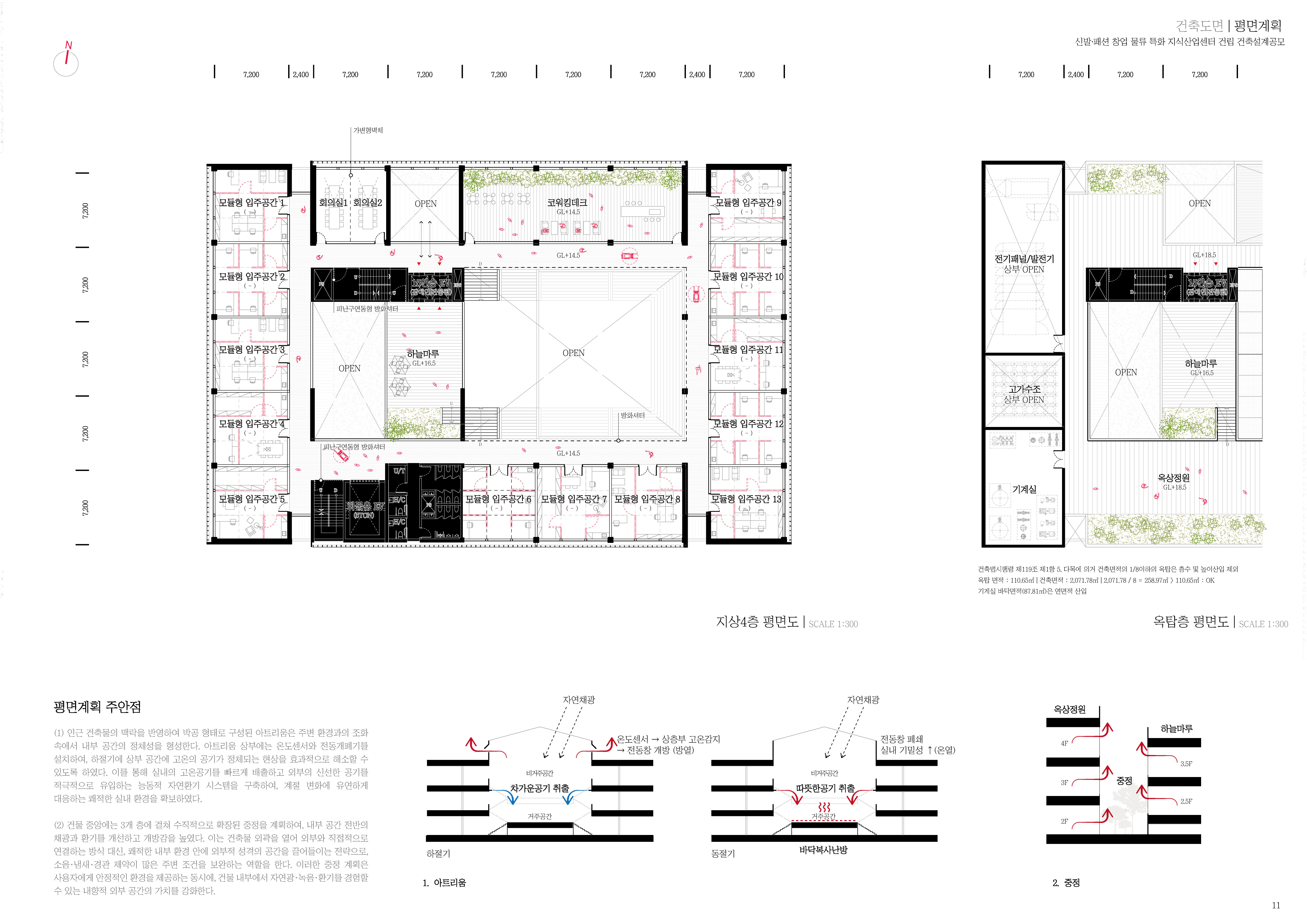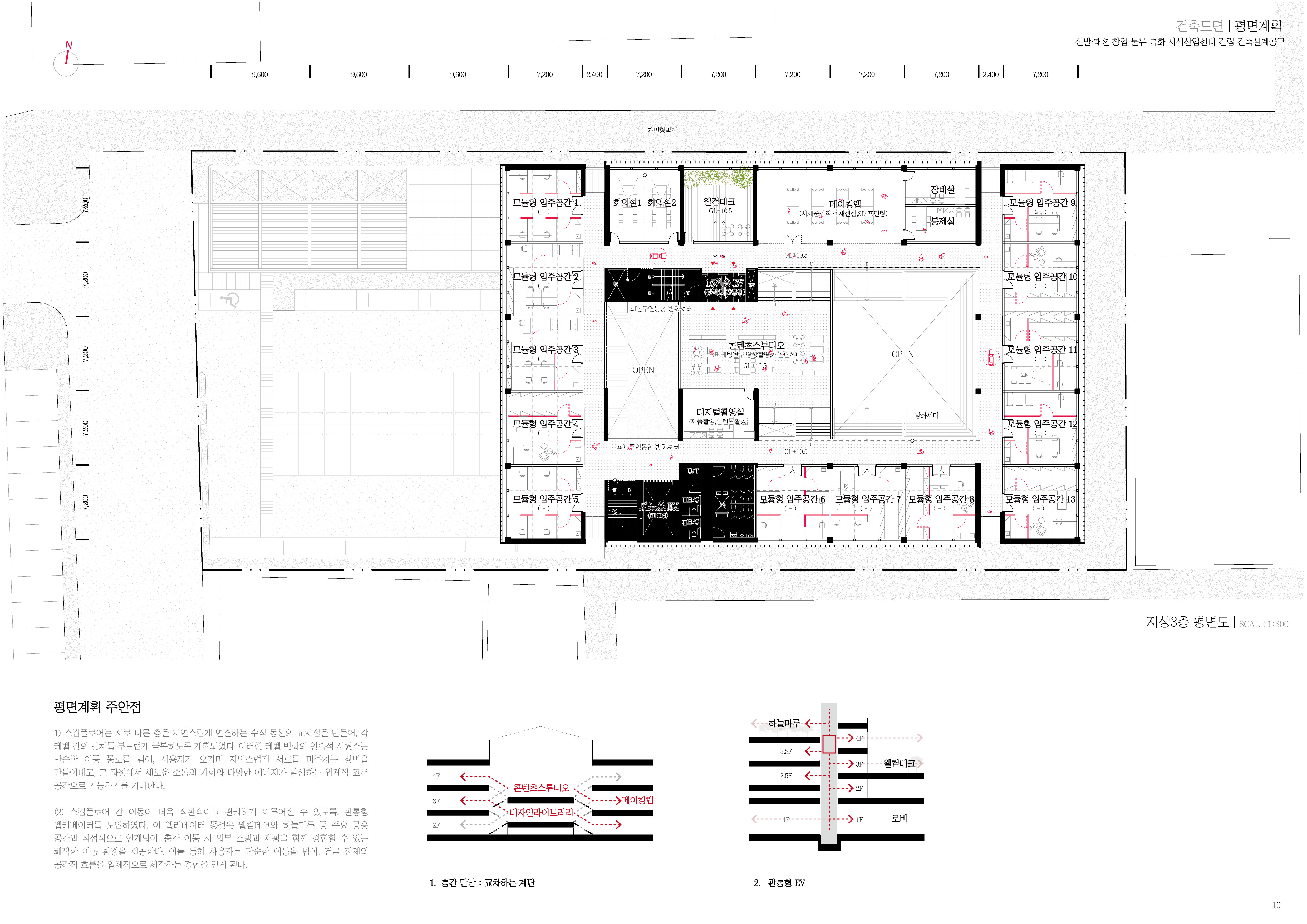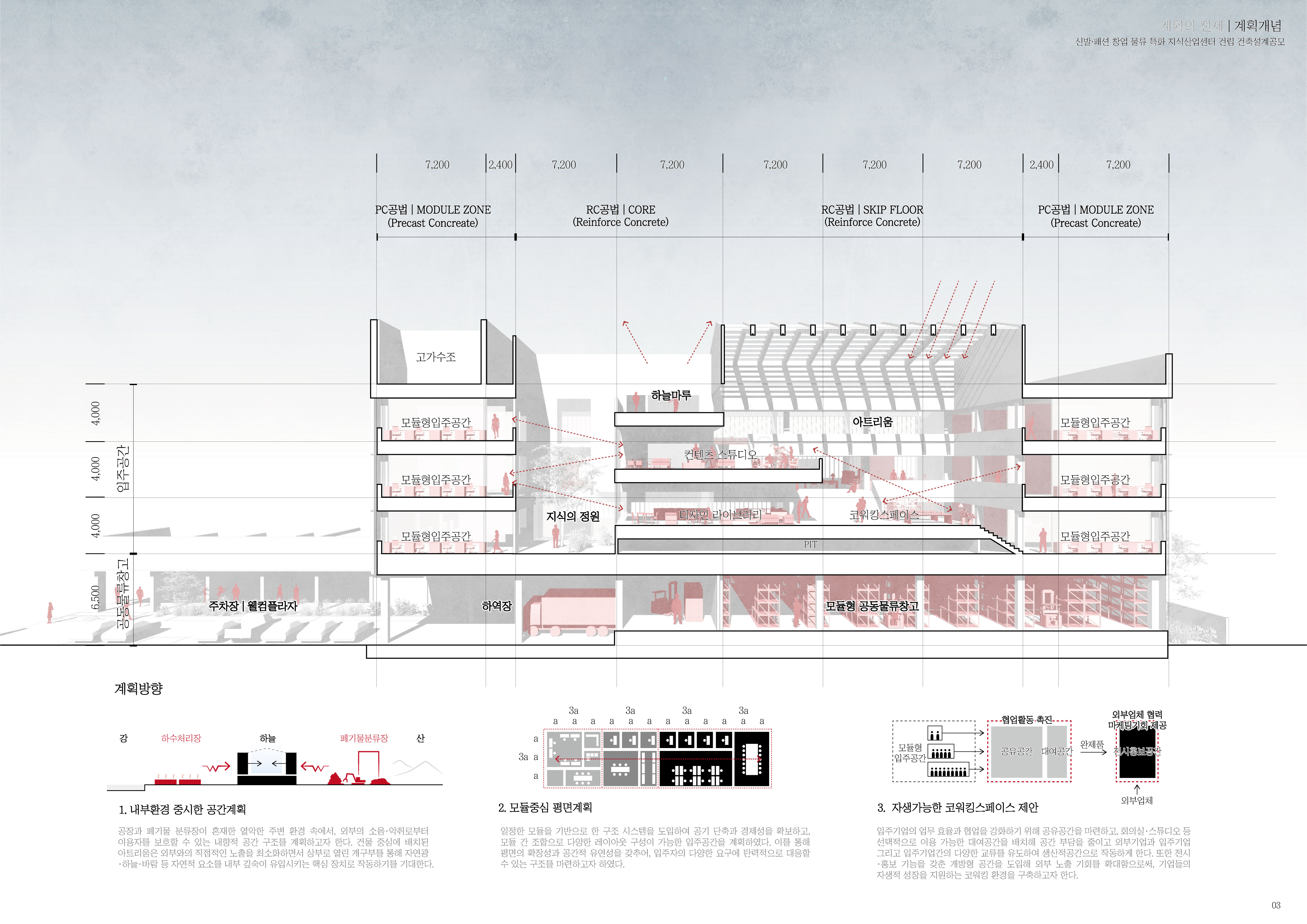 대지분석이 세심하게 되었습니다. 수직, 수평적 공간간의 관계가 돋보입니다. 공사비와 시공성을 고려한 적정한 규모와 구조를 찾으려는 고민도 보입니다. 지식정원, 하늘마루, 옥상정원등 적소에 외부공간을 계획하였습니다. 입구성이 들어나는 진입동선과 맥락을 고려한 보행공간을 계획하였습니다. 1층에 물류창고를 모두배치하여 기능성을 높였고, 물류창고에 대한 지식을 바탕으로 세심한 모듈 제안을 하였습니다. 기능적이면서도 풍부한 아뜨리움공간의 공간감과 쓰임새가 기대가 됩니다. 공유공간을 스킵플로어 형식을 취하여 접근의 위계를 최소화 하려는 노력도 보입니다. 일반주차와 화역주차가 혼재된 것으로 보이나, 주차의 영역은 구분지어져 있는 것으로 판단되고, 순환형 주차동선이 그러한 문제들을 보완해 줄 것으로 판단됩니다.