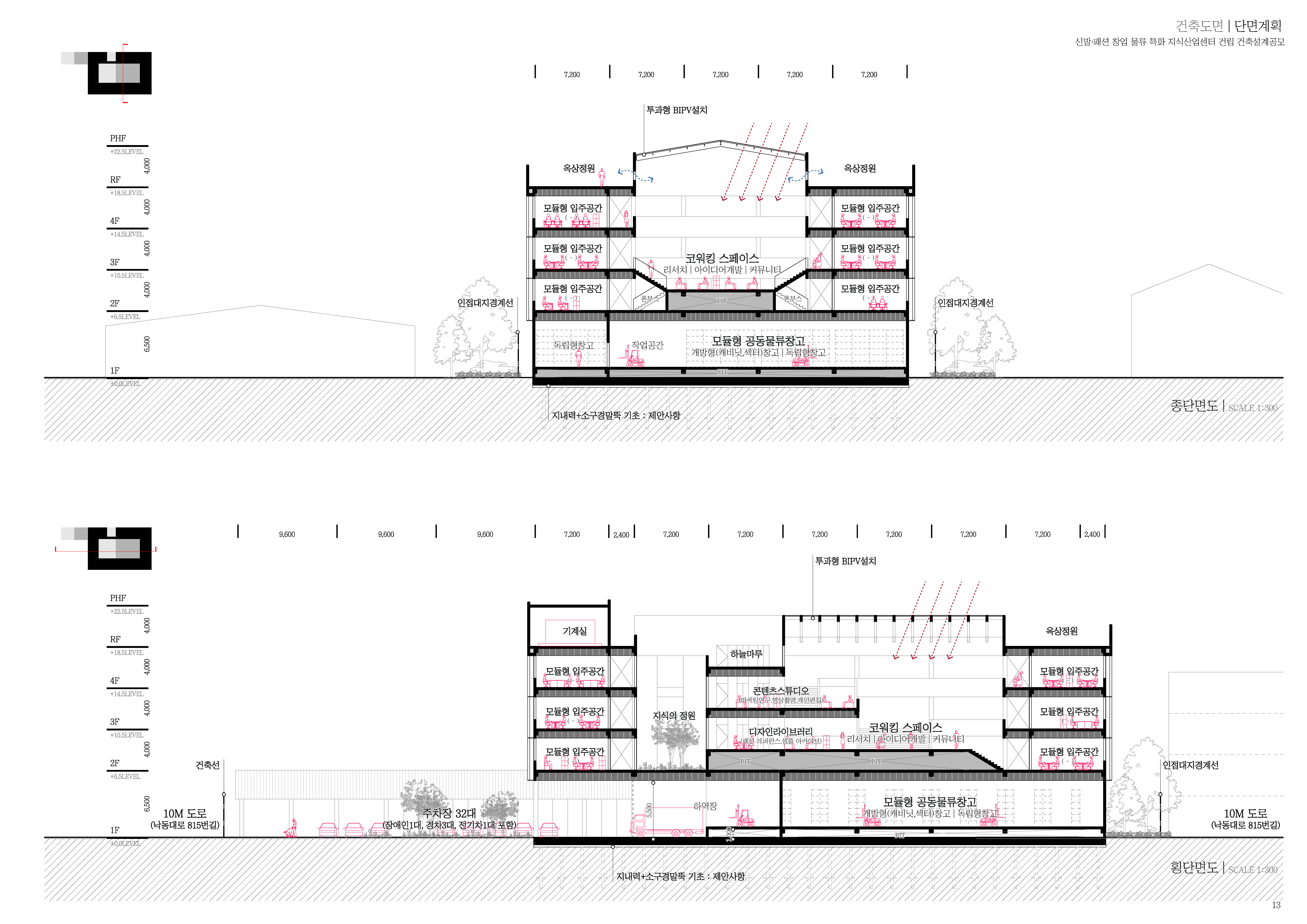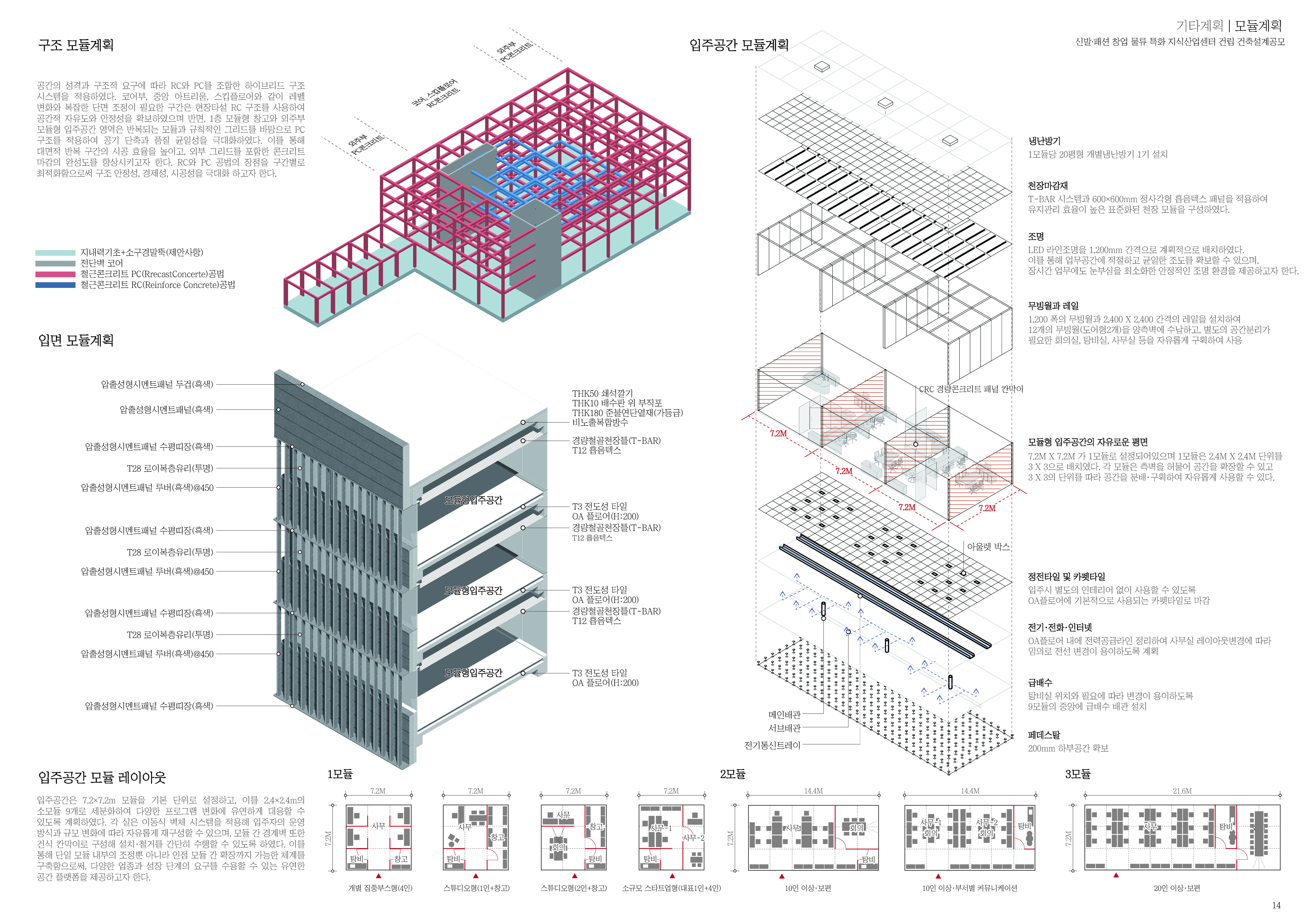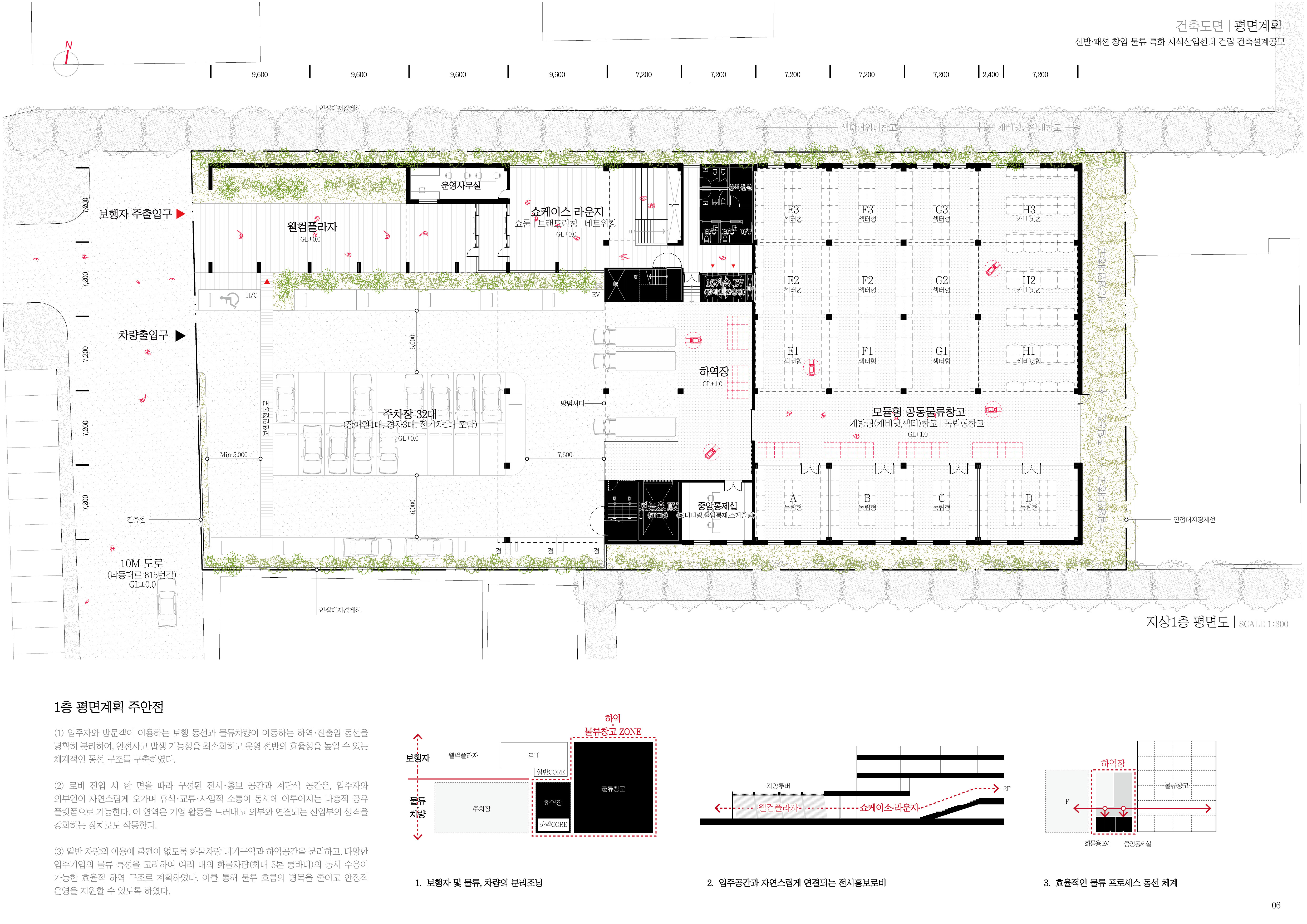 대지분석이 세심하게 되었습니다. 수직, 수평적 공간간의 관계가 돋보입니다. 공사비와 시공성을 고려한 적정한 규모와 구조를 찾으려는 고민도 보입니다. 지식정원, 하늘마루, 옥상정원등 적소에 외부공간을 계획하였습니다. 입구성이 들어나는 진입동선과 맥락을 고려한 보행공간을 계획하였습니다. 1층에 물류창고를 모두배치하여 기능성을 높였고, 물류창고에 대한 지식을 바탕으로 세심한 모듈 제안을 하였습니다. 기능적이면서도 풍부한 아뜨리움공간의 공간감과 쓰임새가 기대가 됩니다. 공유공간을 스킵플로어 형식을 취하여 접근의 위계를 최소화 하려는 노력도 보입니다. 일반주차와 화역주차가 혼재된 것으로 보이나, 주차의 영역은 구분지어져 있는 것으로 판단되고, 순환형 주차동선이 그러한 문제들을 보완해 줄 것으로 판단됩니다.