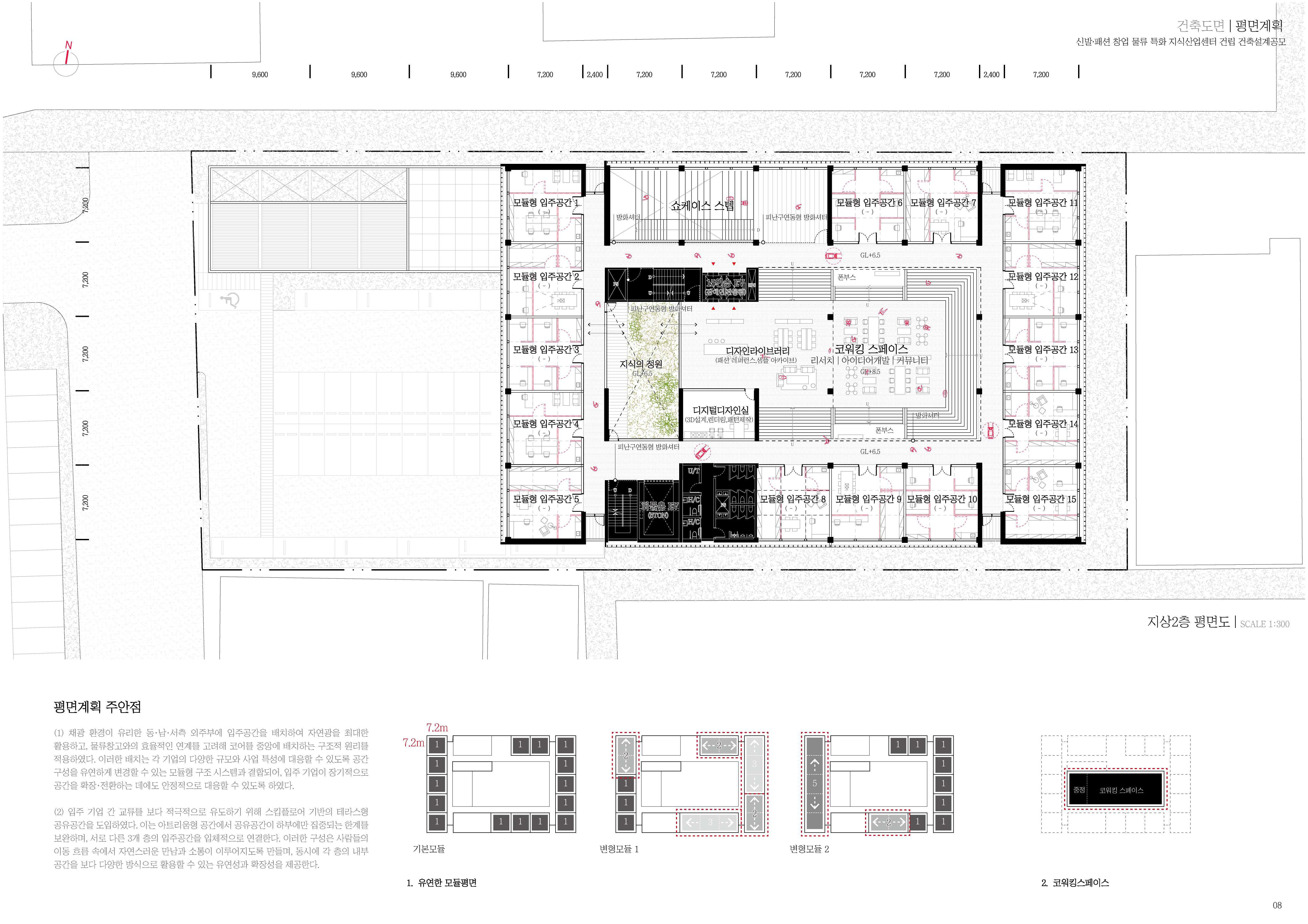 상상을 따라 공간을 이동하며 평면을 읽는 것이 매우 즐거운 작품입니다. 강제되지 않은 동선으로 따라 실내 움직임이 즐겁고 공유공간에 배채된 랩들에서 내부로 개방되어 일하는 모습들이 상상됩니다. 중심공간이 규모가 매우 세심한 비례와 크기로 계획되었다고 평가합니다. 물류창고부분의 대형공간의 가변성도 향후 이동방향이 다양할 것으로 생각됩니다. 좋은 작품 제시해 주셔서 감사드리며 당선을 축하드립니다.