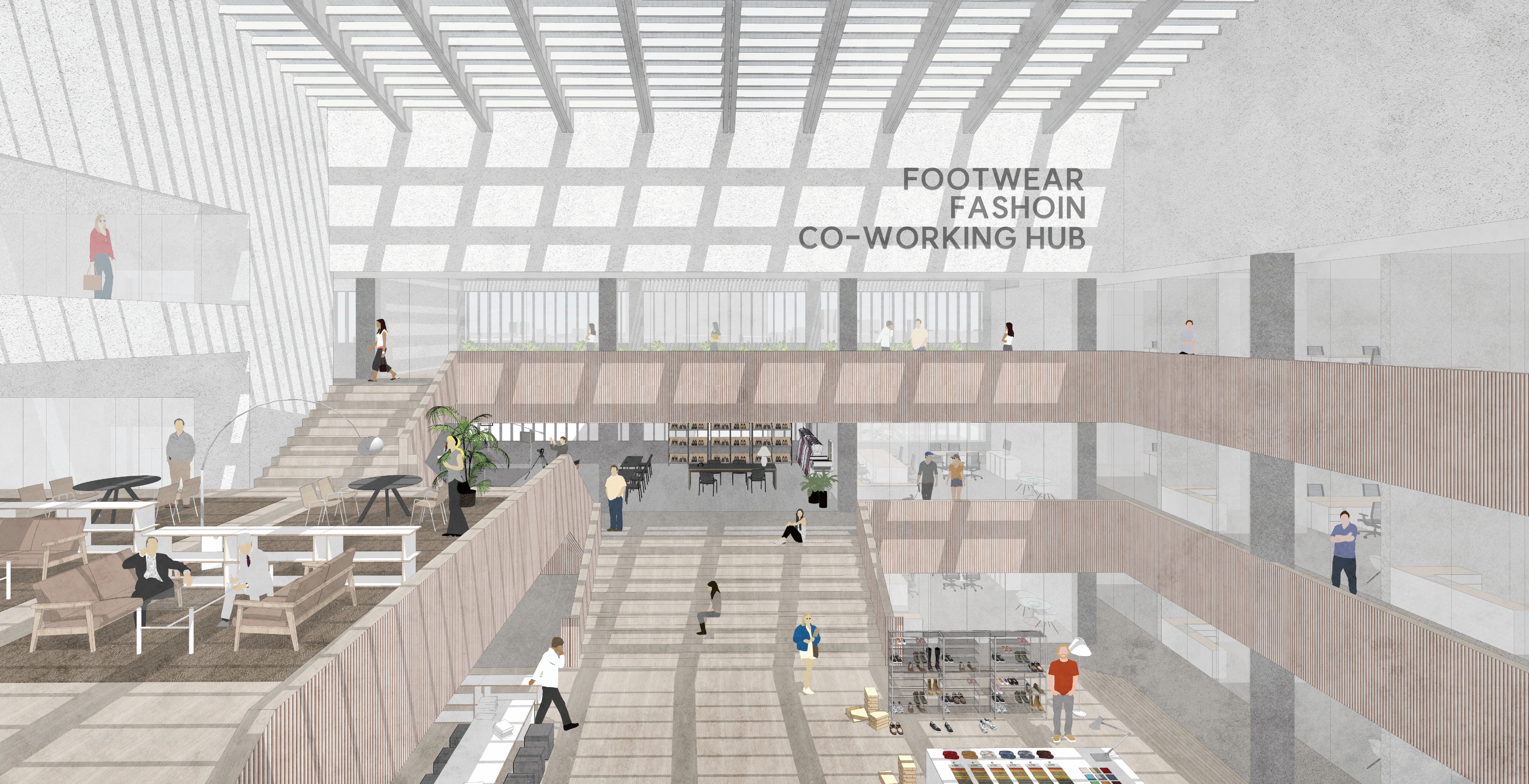 신발·패션 창업 플랫폼은 공장이지만, 입주자에게는 새로운 브랜드와 아이디어가 태어나는 창의적 기반이 되는 공간입니다. 단순 임대가 아니라 함께 실험하고 가능성을 확장하는 공동 창작의 무대를 지향하며, 외부 기업 방문 시에도 입주자가 자부심을 느끼는 ‘자신의 사옥 같은 공간’을 목표로 합니다. 공장지대라는 한계를 넘어 자연 요소를 끌어들이고 사람들이 머무를 수 있는 열린 장소를 만들고자 했습니다. 이를 위해 중심에 배치된 아트리움은 안정적인 채광과 개방감을 제공하며 층간 활동을 연결하는 내부의 열린 풍경으로 계획되었습니다. 이 공간은 직원에게는 편안한 일상을, 창업자에게는 새로운 가능성을, 방문자에게는 협업의 에너지가 느껴지는 환경을 제공합니다. 작은 시도들이 이 아트리움에서 만나며 고유한 창업 생태계를 만들어갈 수 있기를 기대합니다.