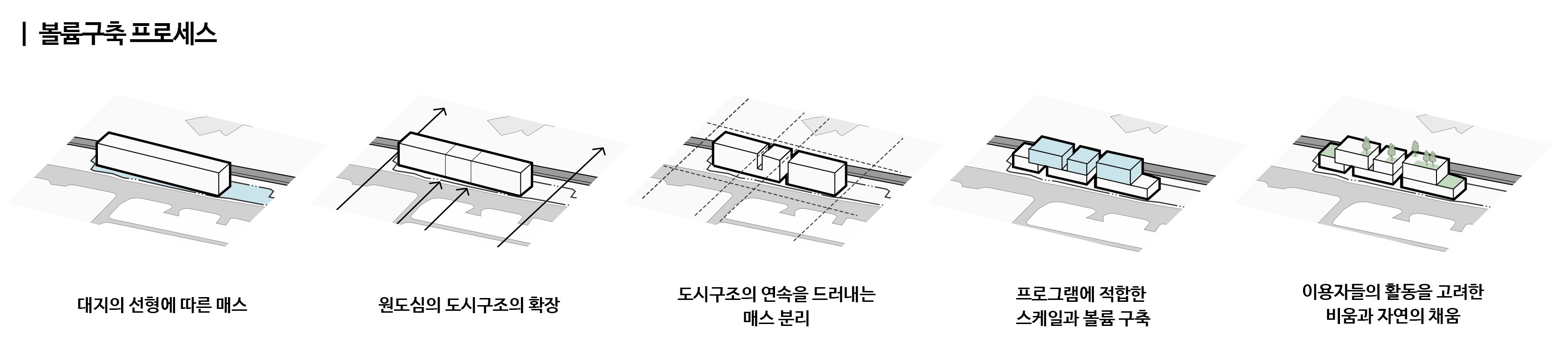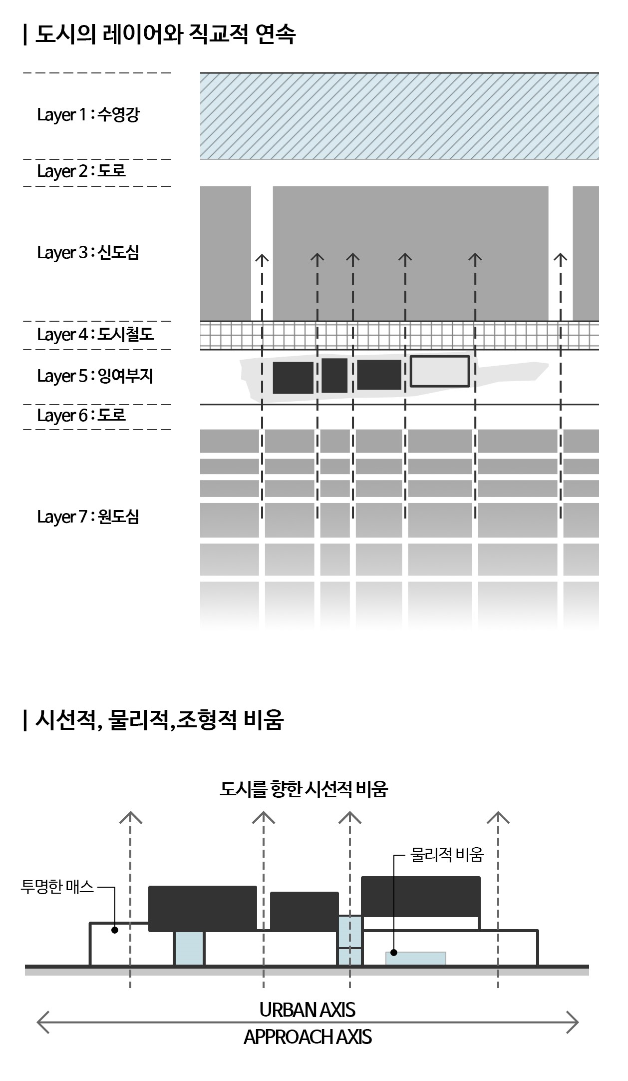 수영강의 흐름에 순응하면서 도시는 선형적인 개발이 이루어졌고, 강의 흐름에 따른 여러 레이어가 만들어지면서 오히려 선형을 거슬러는 방향으로 단절이 생겼다. 이 선형의 구성은 물리적 단절뿐만 아니라 심리적, 정서적, 도시맥락적인 단절을 부추기고 있다. 어쩔수 없이 이 장소에 건축 행위를 해야한다면, 선형적인 레이어에 순응하면서도 시선적인 비움, 물리적인 비움, 조형적인 비움 등을 통해서 서로 소통할 수 있게 하고, 결국 도시를 직교적으로 연속케하여 관계를 맺을 수 있도록 해야한다.