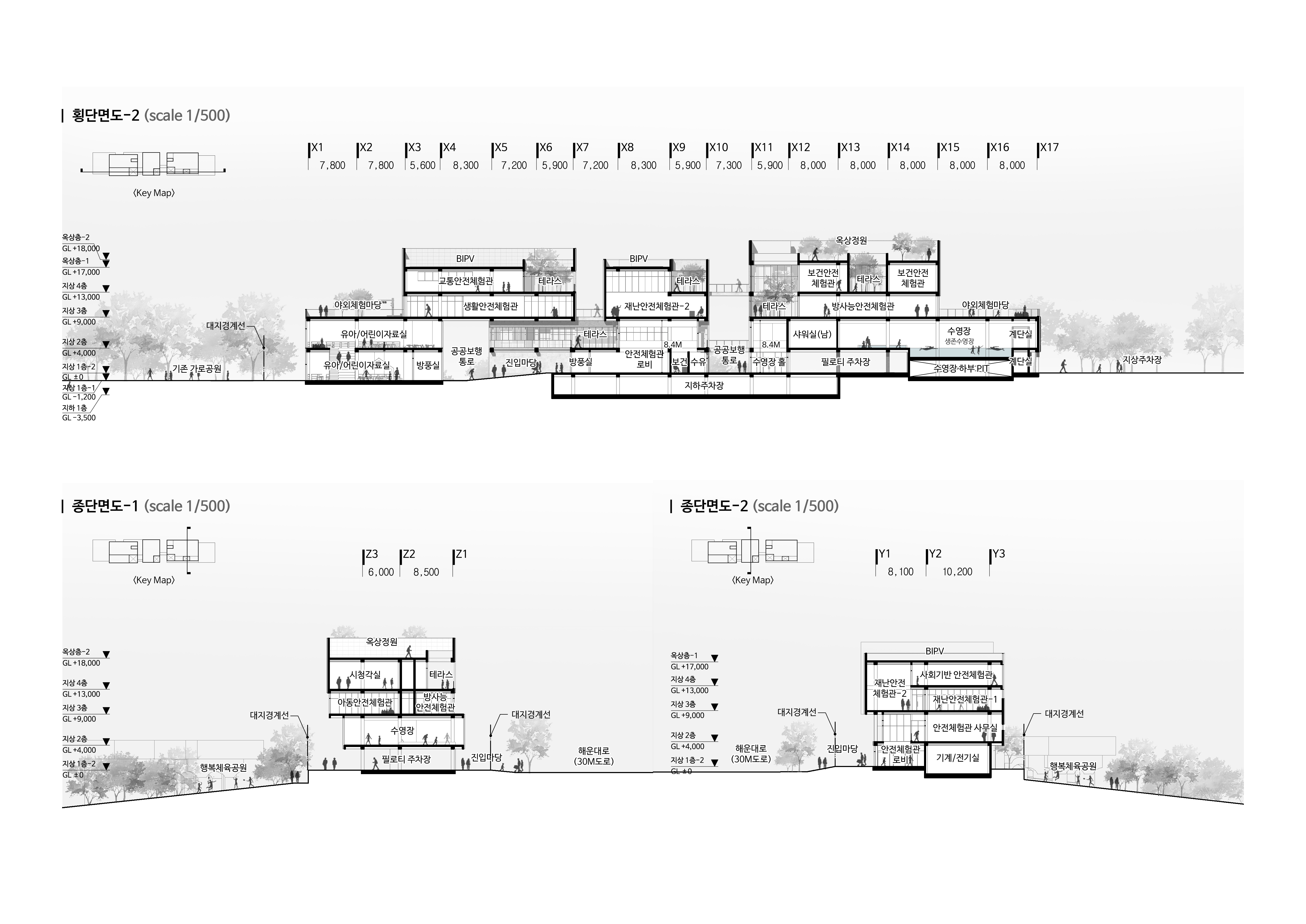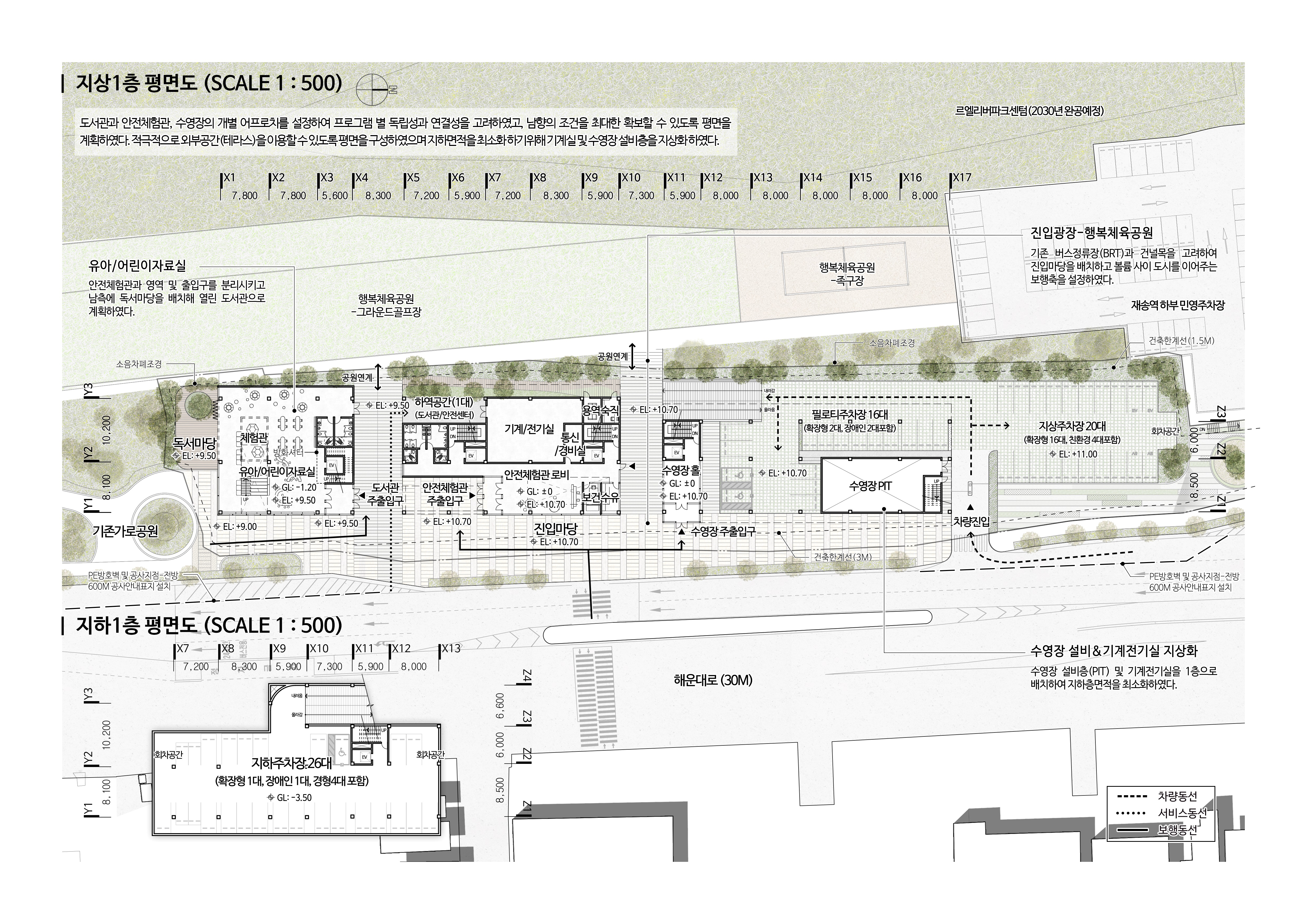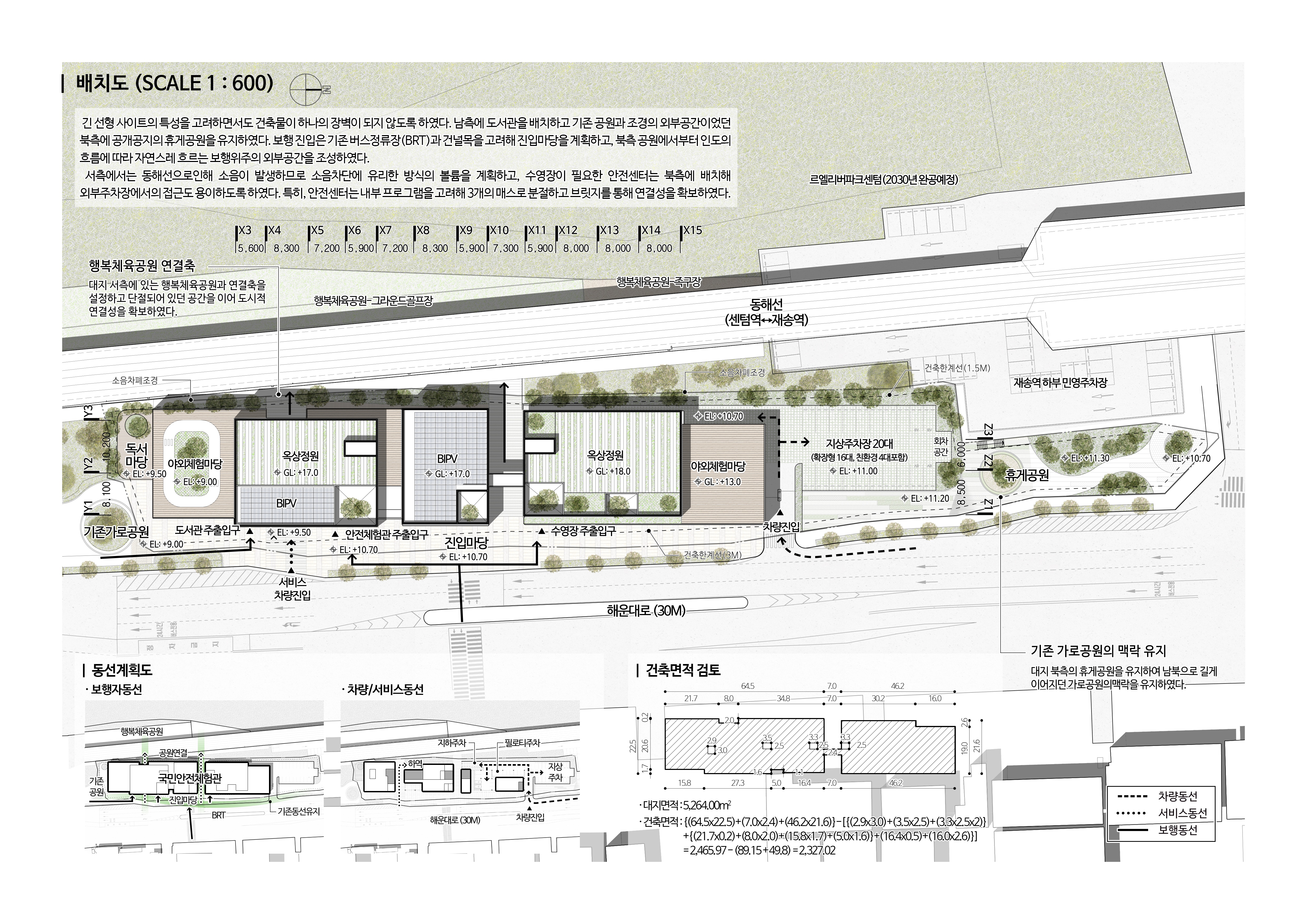 건물 전체를 크게 3개의 기능(도서관/안전체험관/수영장)으로 보아 3개의 매스와 동선을 갖는 안입니다. 덕분에 외부에 공원과 연결되는 보행통로가 2개나 있어 기존 가로공원의 역할을 유지하려는 노력이 느껴집니다. 저층부의 개방감으로 도시와 공공성에 대한 장점이 뚜렷한 안입니다. 출입구의 분리는 목적을 가지고 방문하는 사람에게 명쾌한 동선이 될 수도 있으나, 가장 많은 면적을 차지하는 안전체험관이 3층 이상에 배치되어 있는 점을 감안하면 안전체험관 로비의 크기와 수직동선공간, 공용부가 협소한 부분은 아쉬움이 있습니다. 1층 기계실을 지하에 내려 안전체험관 로비를 행복체육공원 쪽으로 넓히고 고가 밑의 공원으로 개방감을 주었다면 더 좋은 안이 되었을 것 같습니다.