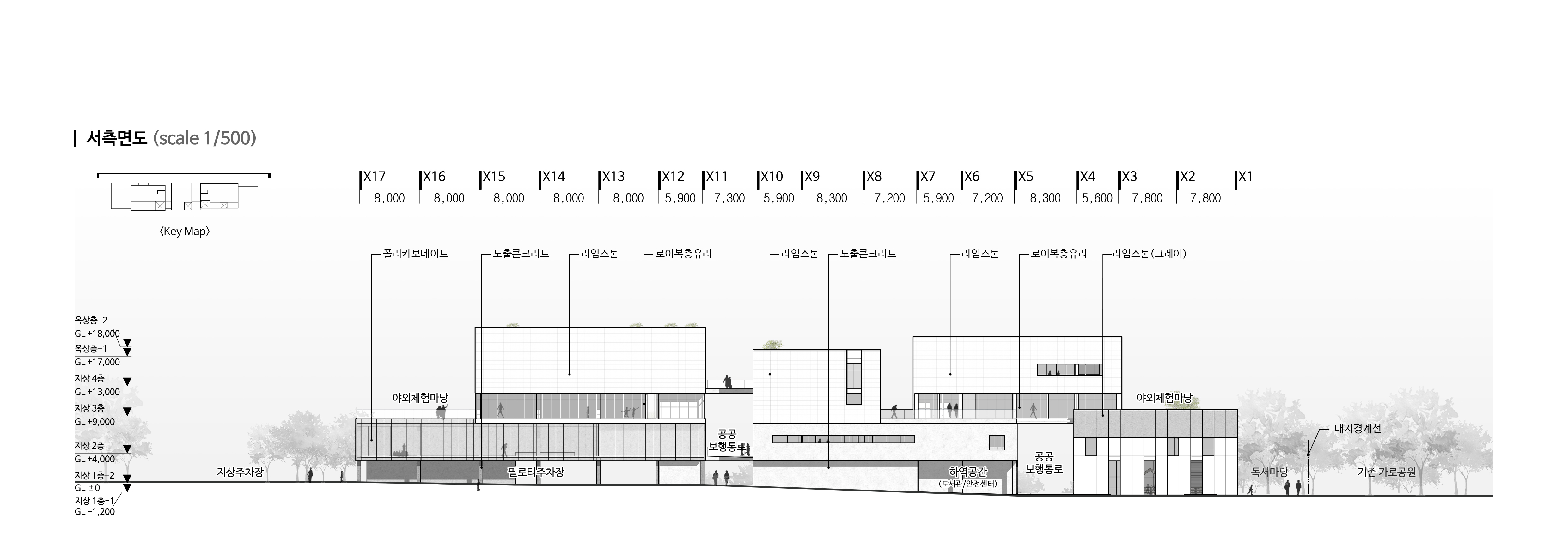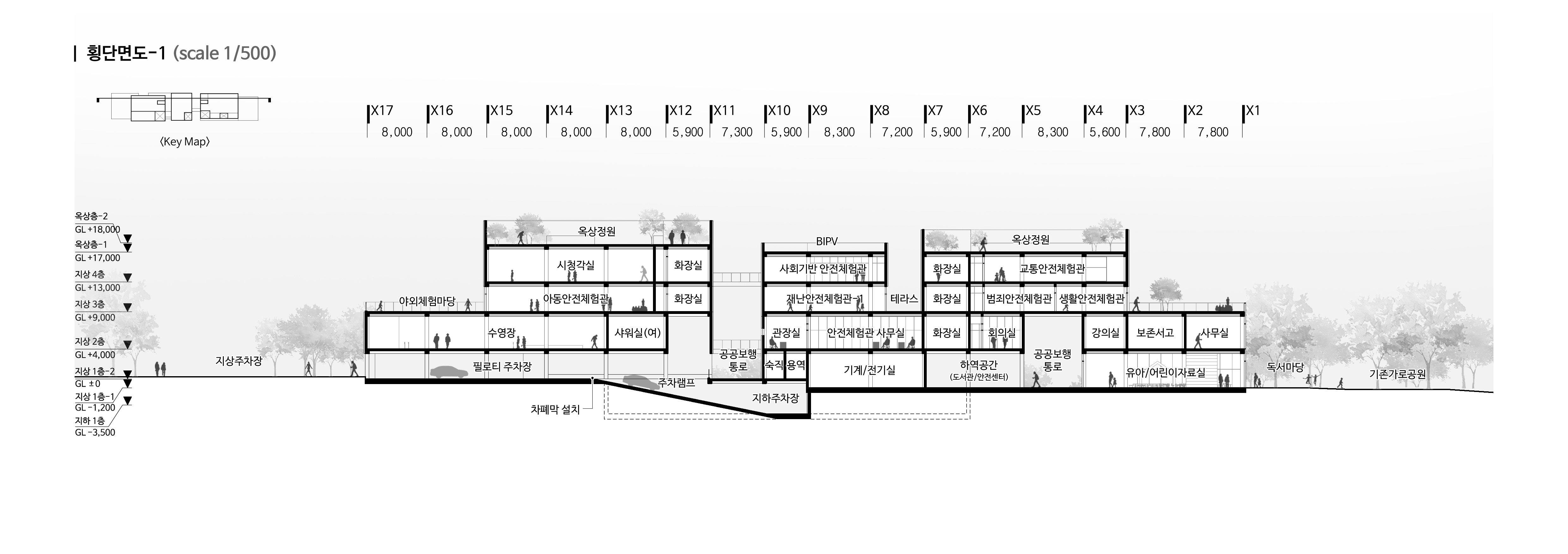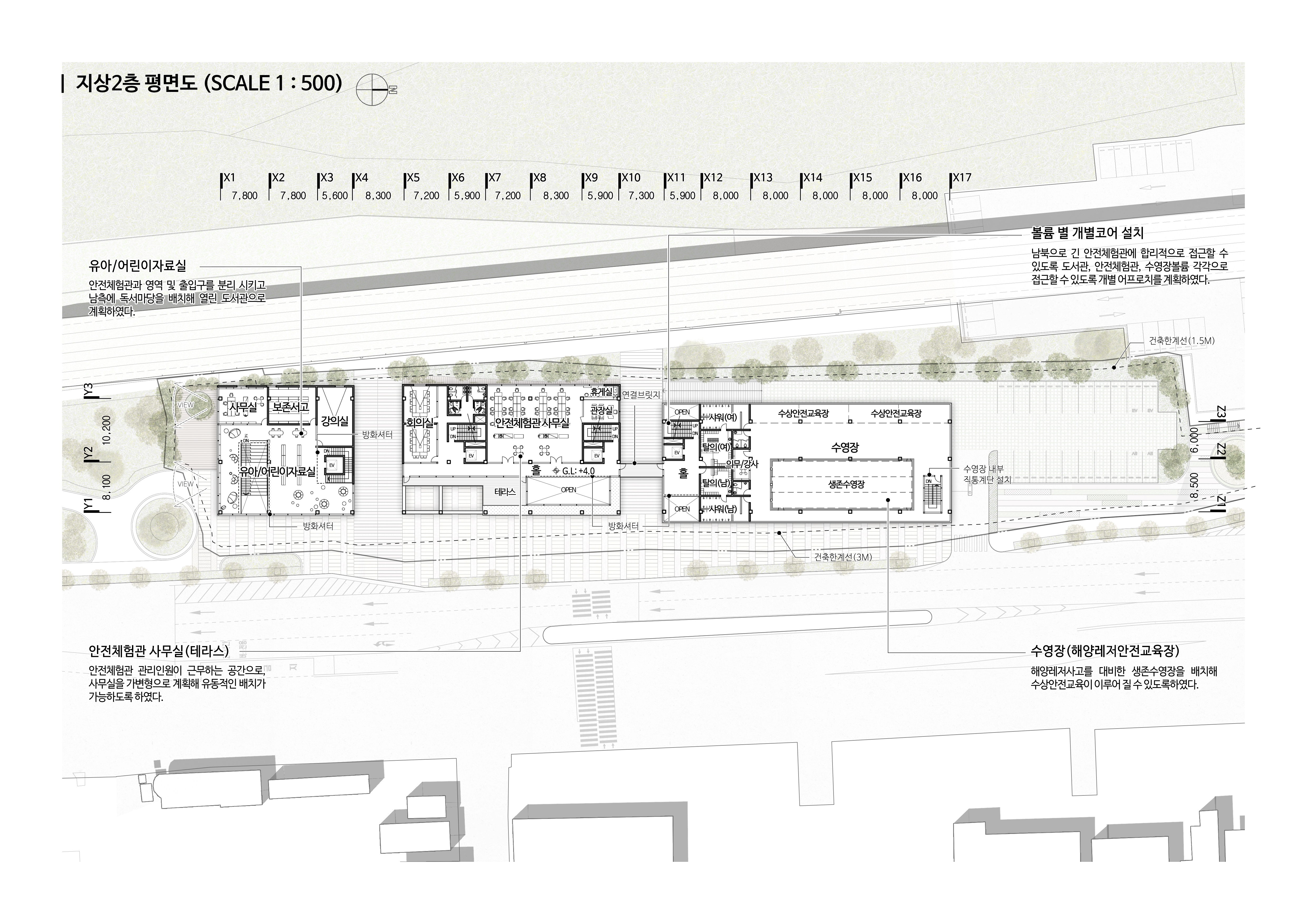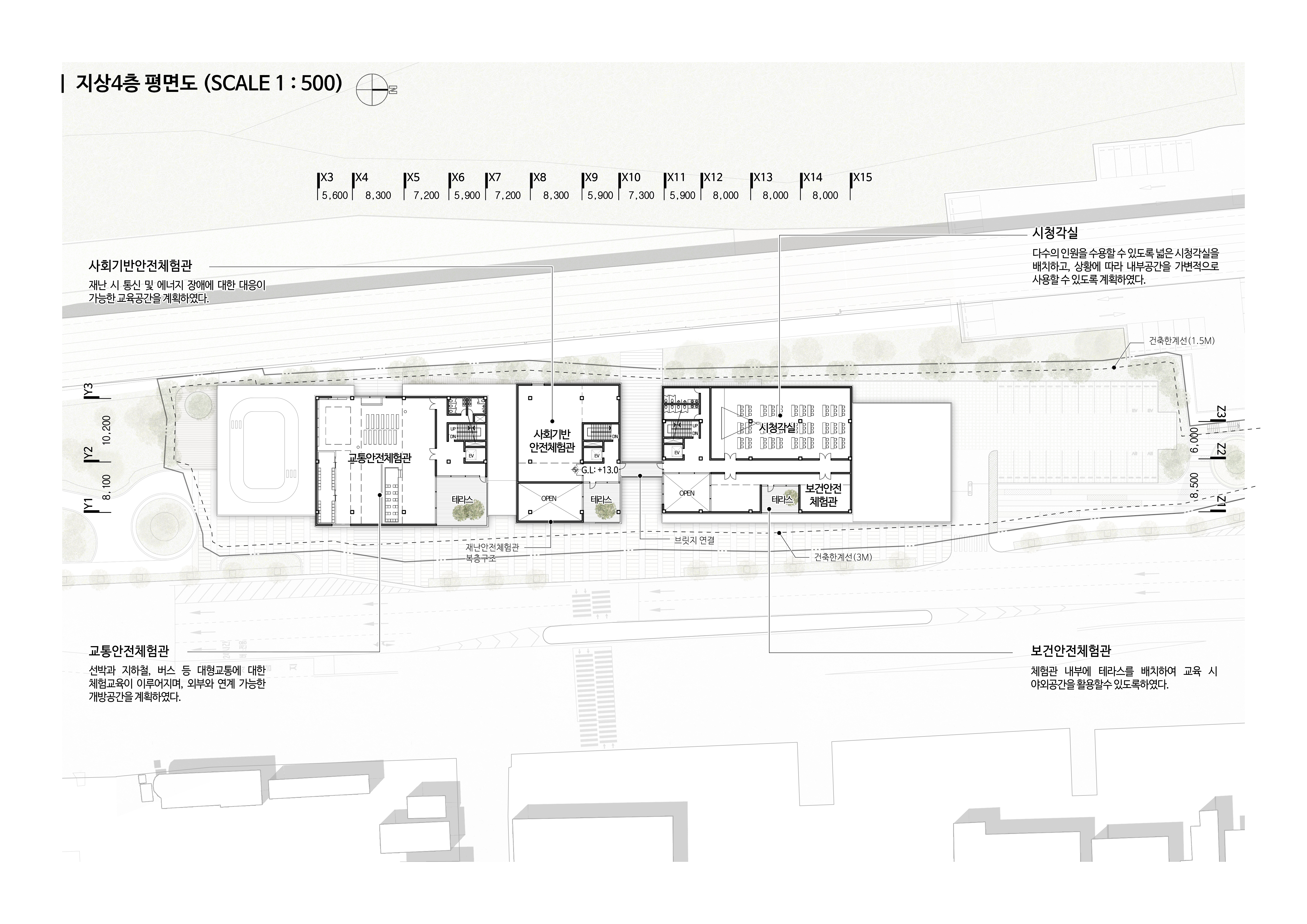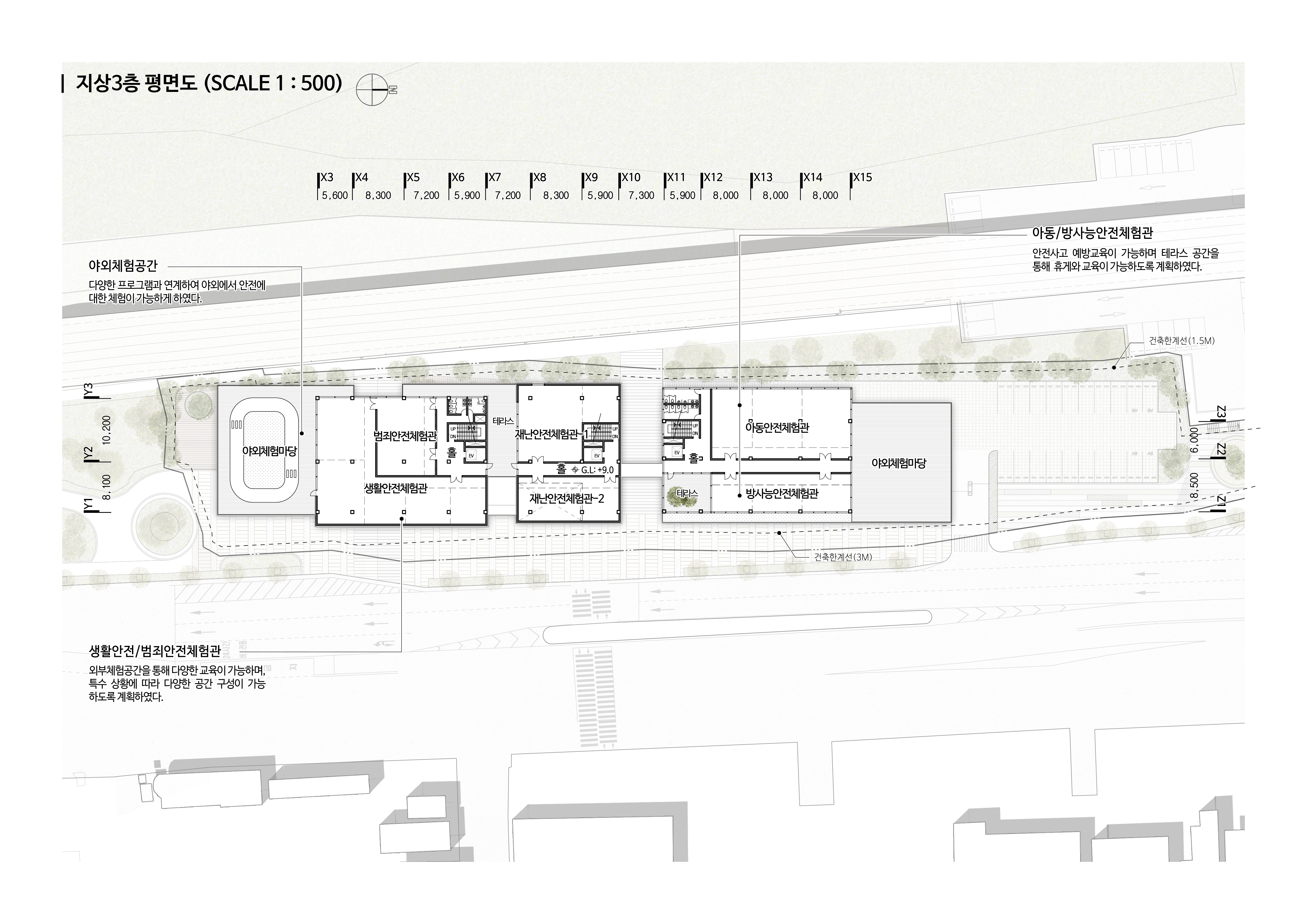 체험관의 기능(도서관, 안전체험관, 수영장)에 따라 3개의 매스로 구분하고 그 사이에 보행통로를 두어 주변과 연계시킨 부분이 가장 특징적입니다. 명확한 목적을 두고 방문하는 이용객에게는 편리할 수 있지만, 연속적인 체험이 어렵고, 상대적으로 계단, EV 등이 많아져 공용 공간이 협소한 것이 단점이 될 수 있습니다.