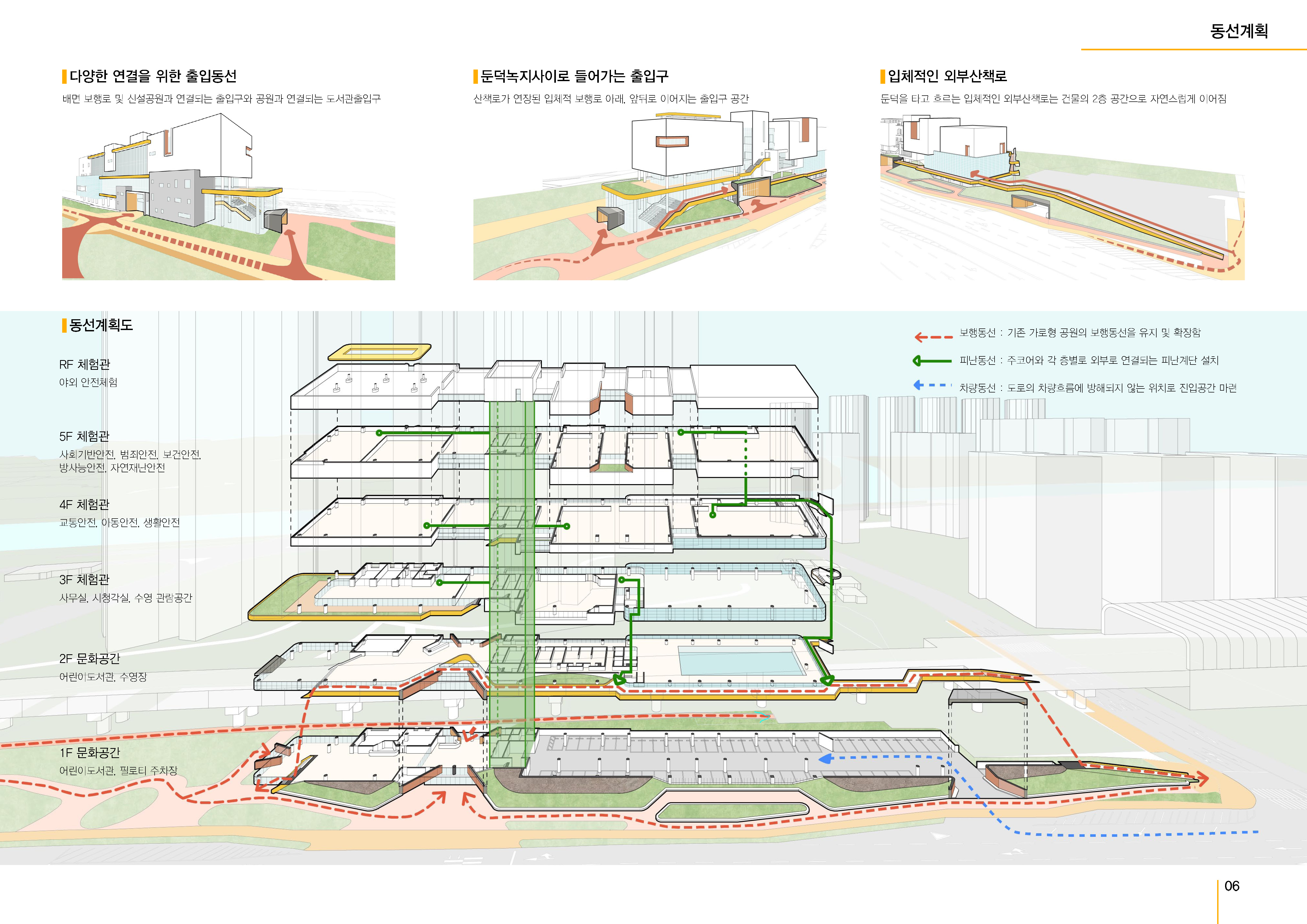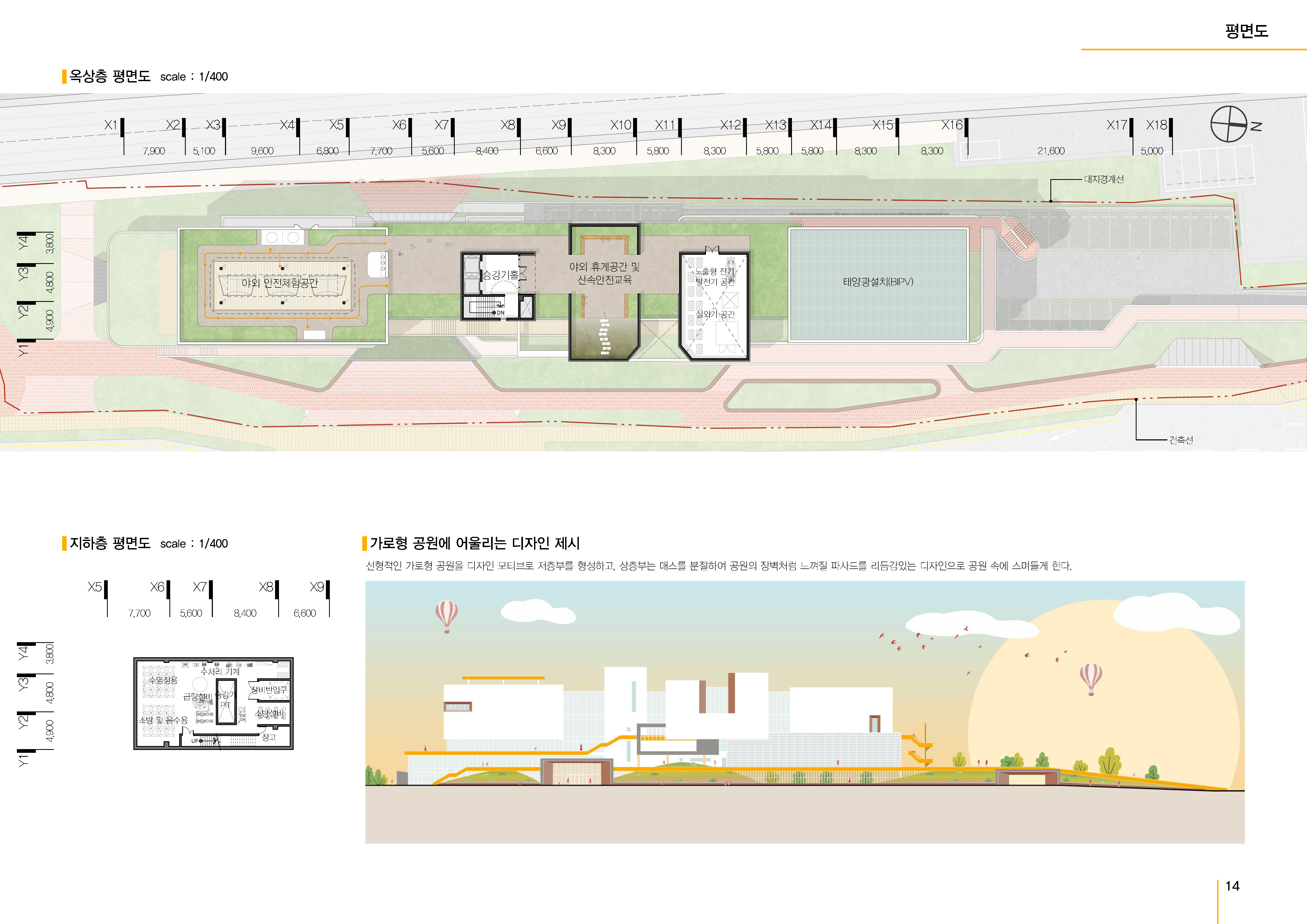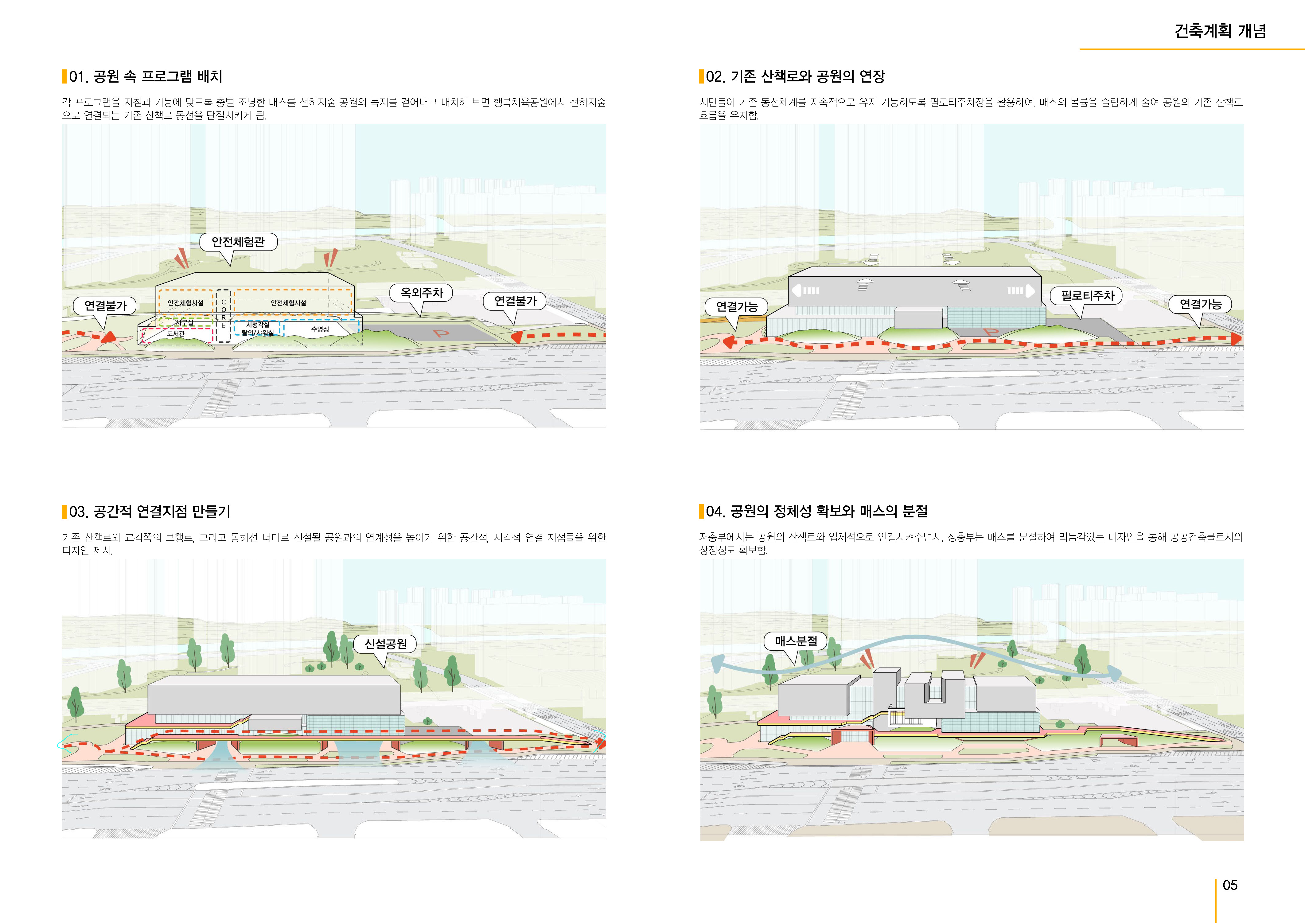 본 시설은 동해선의 센텀역에서부터 원동역까지 이르는 행복체육공원의 중심공간에 건립됩니다. 이런 가로형 공원속에 안전체험관이란 시설이 들어가게 되면 어떤 제스처를 취해야 할지가 가장 고민 되는 지점 중에 하나였습니다. 이 속의 산책로는 공원을 따라 이어져가고 있는 상황입니다. 본 건물은 이런 공원 속에서 갑자기 건물과 맞닥뜨리는 상황을 최소화 하고자 둔덕조경 뒤로 한 발짝 물러나 있습니다. 그러면서 산책로는 둔덕을 끼고 이지고, 건물을 타고 흘러 2층 공간으로 자연스럽게 연결되기도 합니다. 또한 가로형 공원속에 들어가는 안전체험관은 대지 서측에 신설되는 공원과의 연결을 막지 않고, 공원의 흐름을 방해하지 않는 방식으로 점유되어야 할 것입니다. 따라서 가로형 공원이 가지는 특성과 산책로 동선을 유지할 수 있도록 최대한 슬림한 방식으로 볼륨을 만들려고 하였습니다. 이에 더해 배면 보행로와 신설공원과의 연계성을 강화하기 위한 방안으로 매스 내부를 파고들어가는 디자인 제시로 기존의 동선체계의 연결과 시각적 확장을 고려하였습니다. 최종적으로 산책로위에 들어설 안전체험관의 매스는 긴 교각과 함께 앞뒤로 배치되어 장방형 솔리드매스의 위압감이 커지게 될 것입니다. 이를 해결할 방법으로 매스를 분절하여 리듬감 있는 입면을 디자인하고, 가로형 공원의 정체성까지 확보하고자 합니다. 이런 상황속에 저층부의 산책하다 만나게 되는 어린이 도서관은 열린 공간화 시켜 산책로를 따라 위아래로 움직이고, 숲속에서 책을 읽는 공간으로 느껴지게 될 것입니다. 필로티주차장은 둔덕으로 가려져 공원속에서 주차장이 드러나지 않게 하고, 그 위 많은 물을 담게 되는 수영장을 배치합니다. 중간층에는 관리를 위한 사무공간과 다목적으로 사용될 시청각실을 배치합니다. 최상층에는 이 시설의 핵심시설인 안전체험관을 독립적으로 배치하고, 옥상의 야외까지 체험의 공간으로 활용하였습니다. 그리고 각 체험공간앞에 대기 및 오리엔테이션 공간을 마련하여 투어동선들의 간섭이 일어나지 않도록 고려하였습니다. 이렇게 각 공간들의 기능의 합리성은 확실하게 확보하면서도, 공원이 가지는 정체성 또한 훼손되지 않도록 노력하였습니다. 또한 그 속에서 안전이란 상징성을 디자인적으로도 확보하였습니다. 바라건대 숲을 즐기며, 안전의식을 고취시키는 공간이 되길 기대합니다.