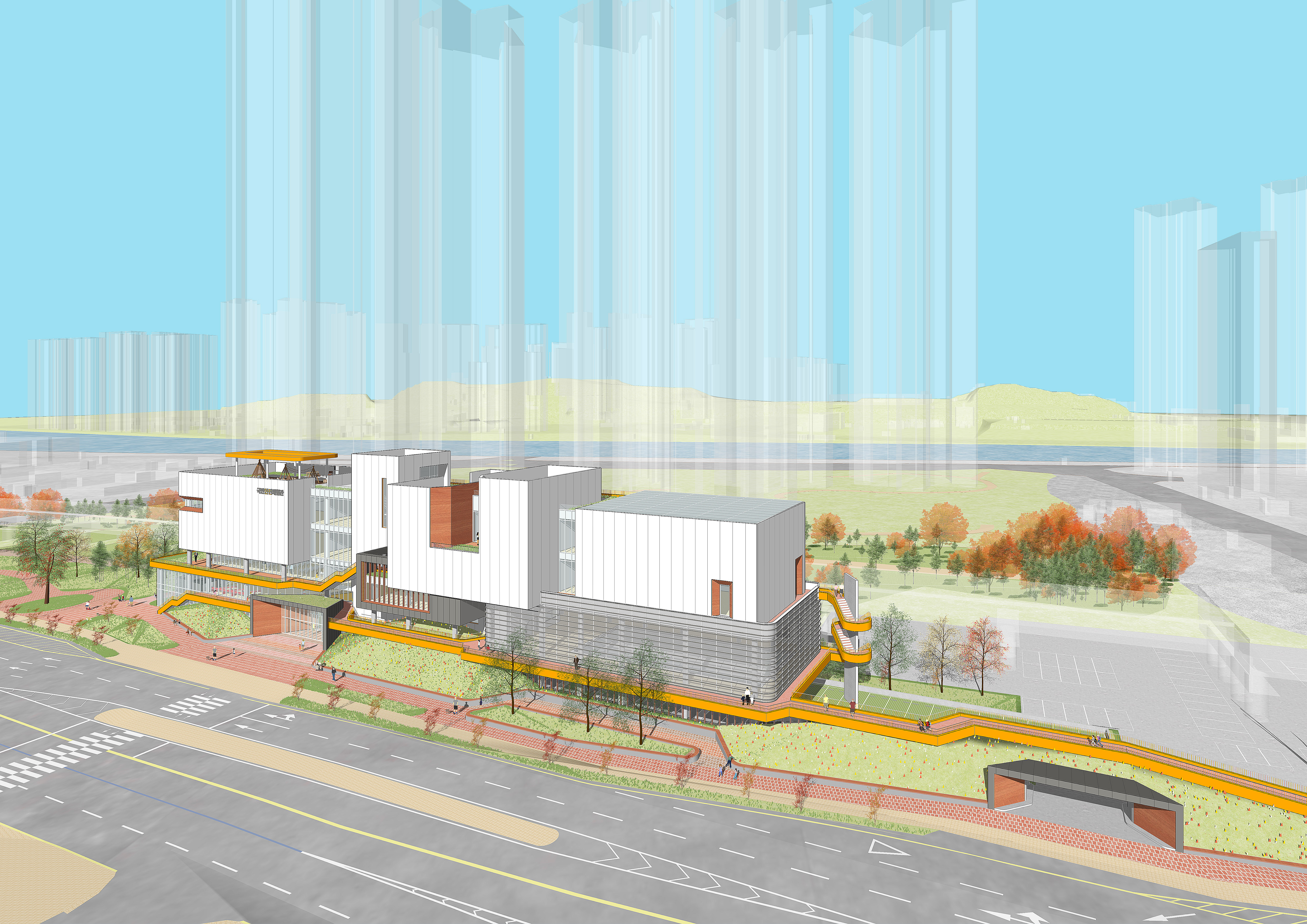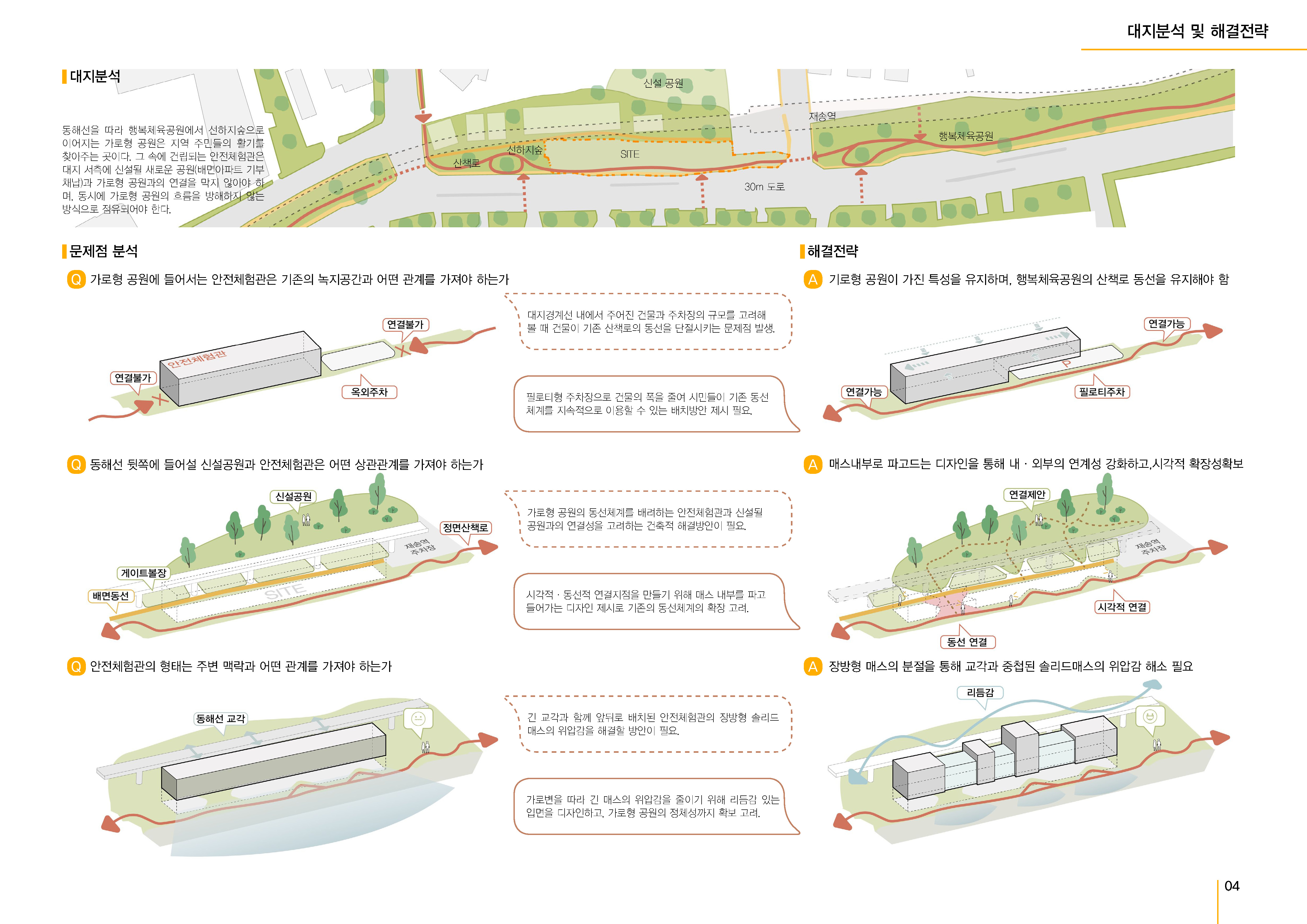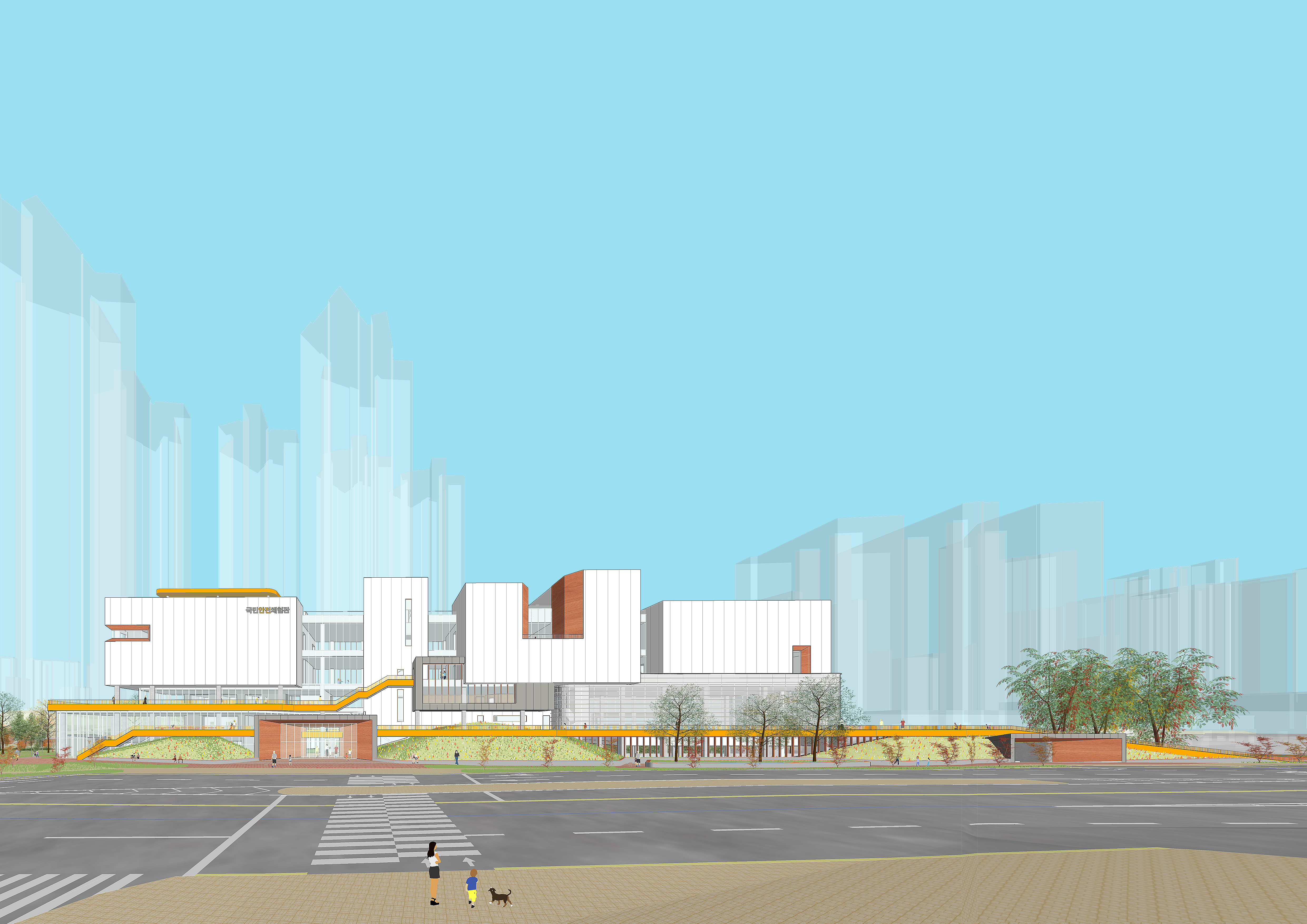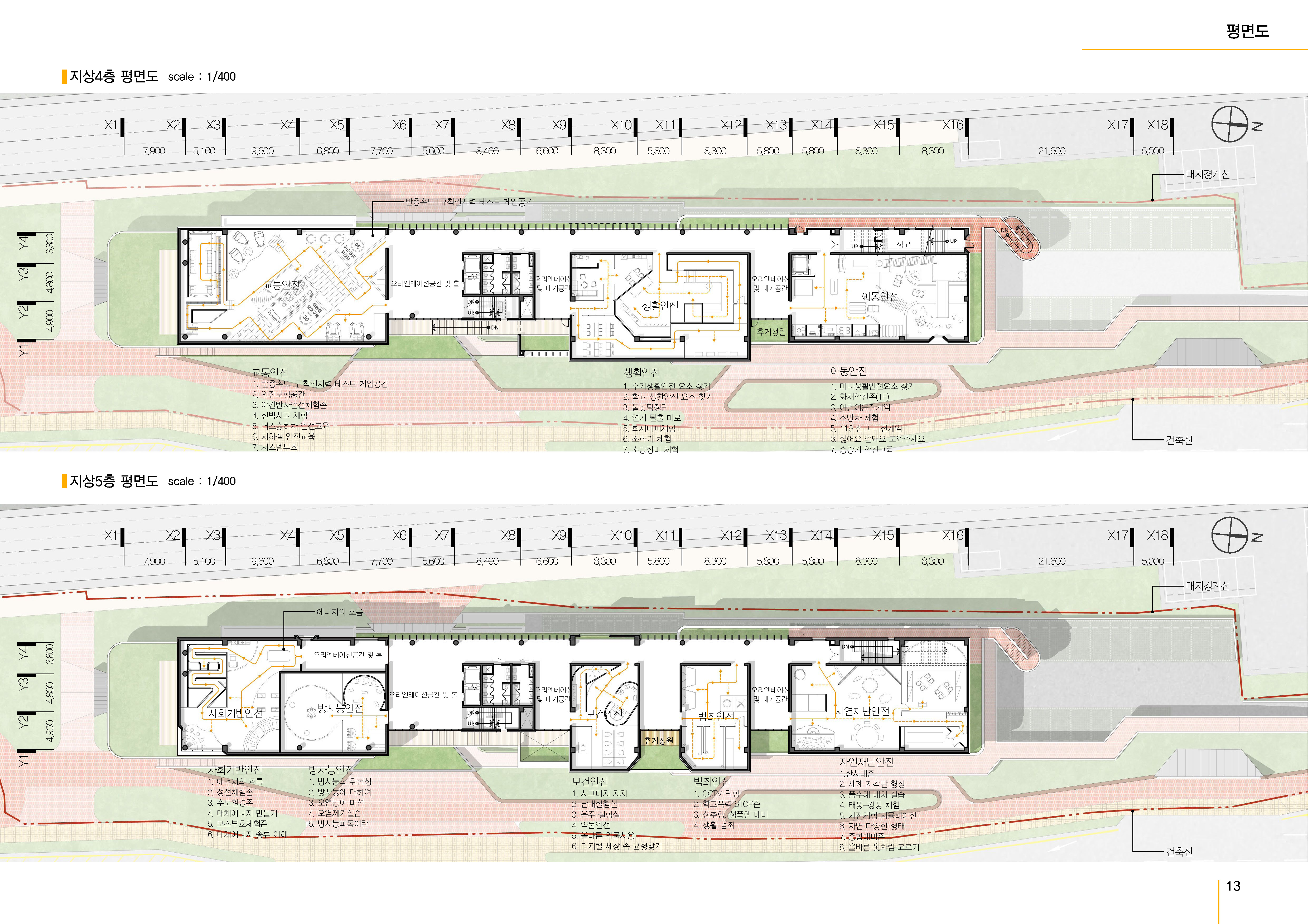 본 시설은 동해선의 센텀역에서부터 원동역까지 이르는 행복체육공원의 중심공간에 건립됩니다. 이런 가로형 공원속에 안전체험관이란 시설이 들어가게 되면 어떤 제스처를 취해야 할지가 가장 고민 되는 지점 중에 하나였습니다. 이 속의 산책로는 공원을 따라 이어져가고 있는 상황입니다. 본 건물은 이런 공원 속에서 갑자기 건물과 맞닥뜨리는 상황을 최소화 하고자 둔덕조경 뒤로 한 발짝 물러나 있습니다. 그러면서 산책로는 둔덕을 끼고 이지고, 건물을 타고 흘러 2층 공간으로 자연스럽게 연결되기도 합니다. 또한 가로형 공원속에 들어가는 안전체험관은 대지 서측에 신설되는 공원과의 연결을 막지 않고, 공원의 흐름을 방해하지 않는 방식으로 점유되어야 할 것입니다. 따라서 가로형 공원이 가지는 특성과 산책로 동선을 유지할 수 있도록 최대한 슬림한 방식으로 볼륨을 만들려고 하였습니다. 이에 더해 배면 보행로와 신설공원과의 연계성을 강화하기 위한 방안으로 매스 내부를 파고들어가는 디자인 제시로 기존의 동선체계의 연결과 시각적 확장을 고려하였습니다. 최종적으로 산책로위에 들어설 안전체험관의 매스는 긴 교각과 함께 앞뒤로 배치되어 장방형 솔리드매스의 위압감이 커지게 될 것입니다. 이를 해결할 방법으로 매스를 분절하여 리듬감 있는 입면을 디자인하고, 가로형 공원의 정체성까지 확보하고자 합니다. 이런 상황속에 저층부의 산책하다 만나게 되는 어린이 도서관은 열린 공간화 시켜 산책로를 따라 위아래로 움직이고, 숲속에서 책을 읽는 공간으로 느껴지게 될 것입니다. 필로티주차장은 둔덕으로 가려져 공원속에서 주차장이 드러나지 않게 하고, 그 위 많은 물을 담게 되는 수영장을 배치합니다. 중간층에는 관리를 위한 사무공간과 다목적으로 사용될 시청각실을 배치합니다. 최상층에는 이 시설의 핵심시설인 안전체험관을 독립적으로 배치하고, 옥상의 야외까지 체험의 공간으로 활용하였습니다. 그리고 각 체험공간앞에 대기 및 오리엔테이션 공간을 마련하여 투어동선들의 간섭이 일어나지 않도록 고려하였습니다. 이렇게 각 공간들의 기능의 합리성은 확실하게 확보하면서도, 공원이 가지는 정체성 또한 훼손되지 않도록 노력하였습니다. 또한 그 속에서 안전이란 상징성을 디자인적으로도 확보하였습니다. 바라건대 숲을 즐기며, 안전의식을 고취시키는 공간이 되길 기대합니다.