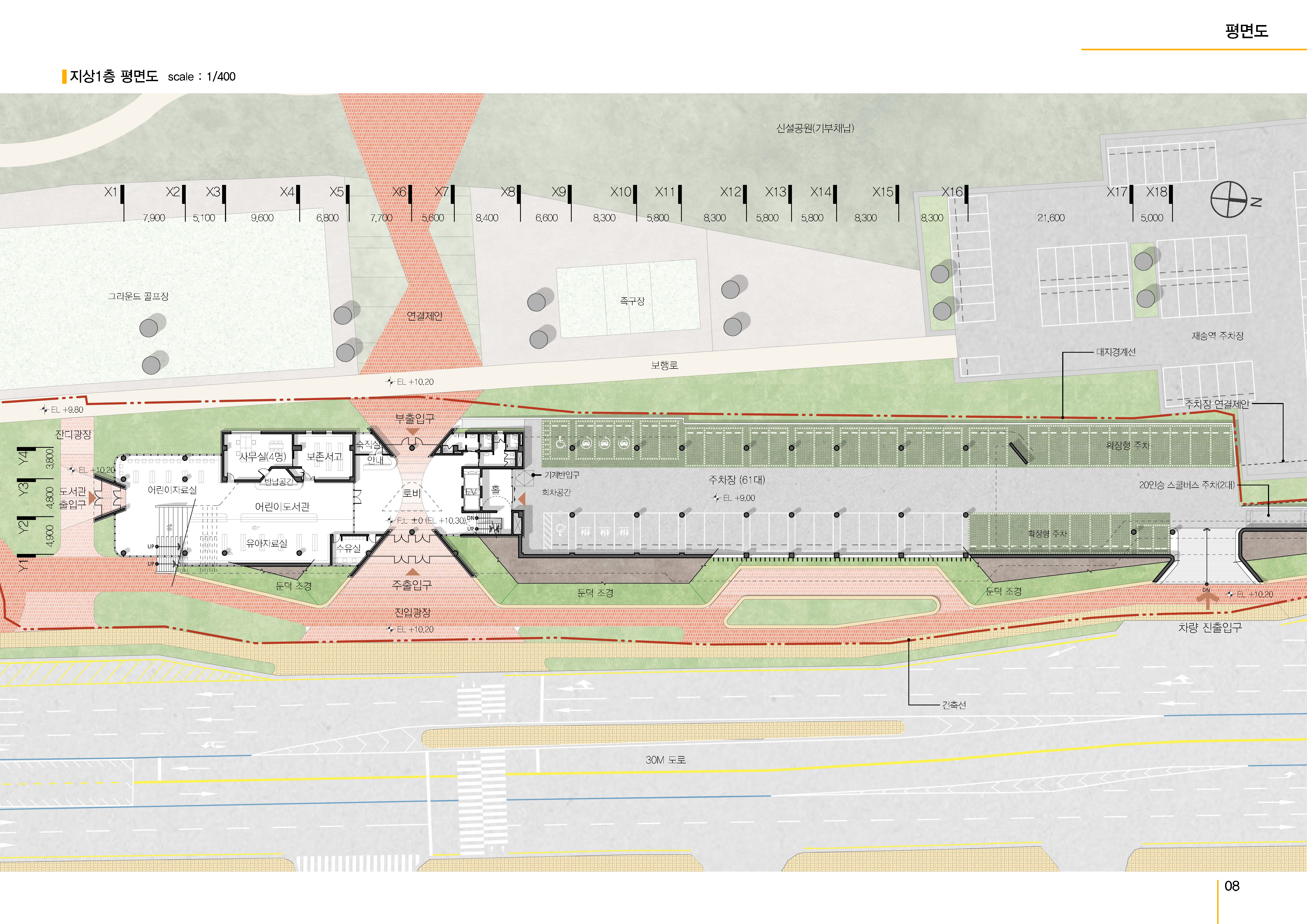 주차장의 면적과 길이가 크다 보니 동측 가로에서의 이미지를 고려하여 주차장을 낮추고 조경 둔덕으로 가려 가로에서의 이미지를 개선한 부분은 참신한 점으로 보입니다. 다만 어린이도서관 부분의 둔덕은 공원과의 연결을 위해 없애는 것이 바람직해 보입니다. 외부동선이 과한 부분은 있지만 남북의 가로공원을 계승하고 공공성을 강조하려는 노력으로 보입니다. 지하 굴토량을 최소화하고 지상 5층의 매스임에도 분절을 통한 개방감과 스케일을 조정하여 가로의 환경을 배려한 점은 장점으로 보입니다. 1층 홀의 개방감과 전층의 내부동선을 개선한다면 좋은 안이 될 것 같습니다.