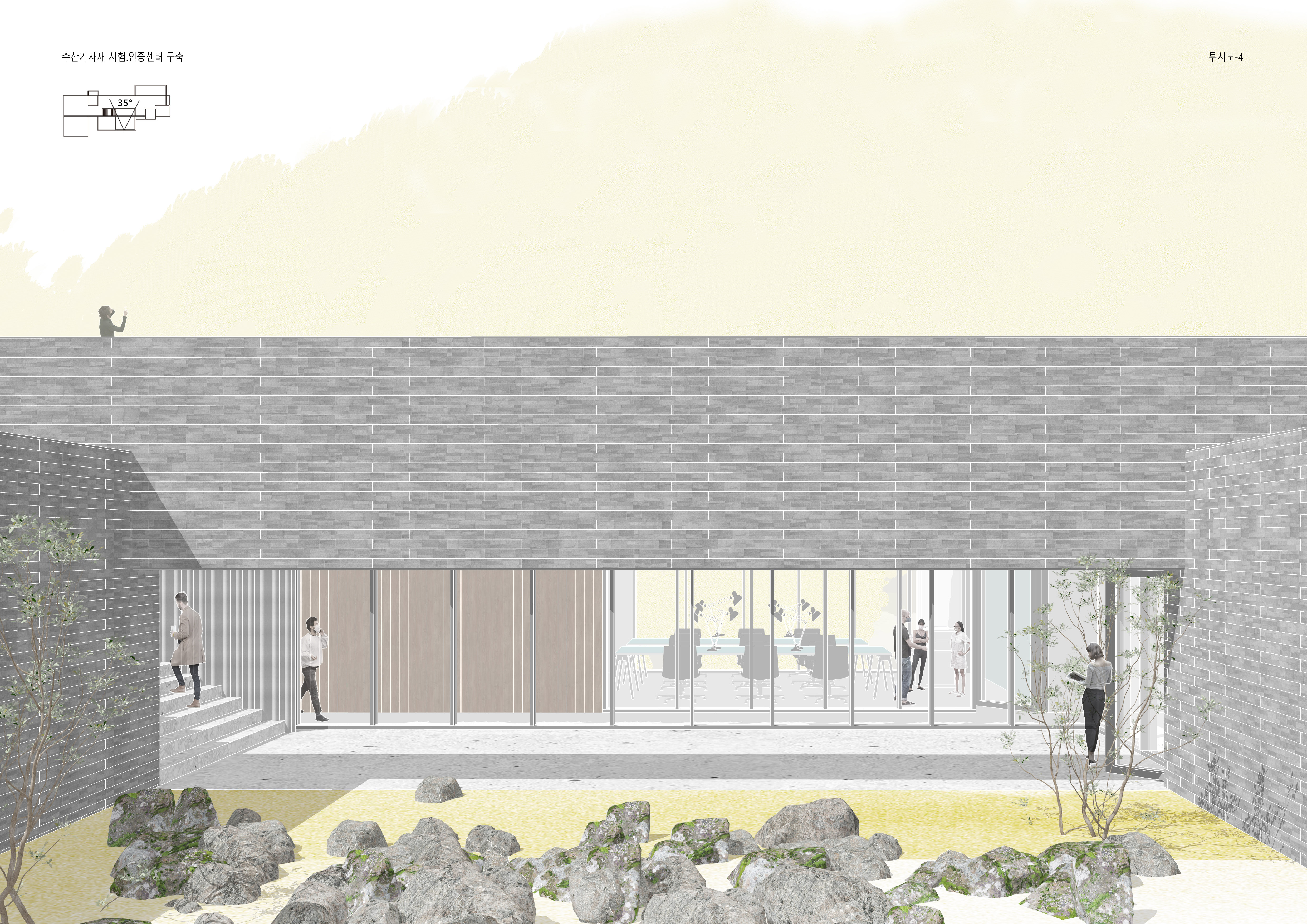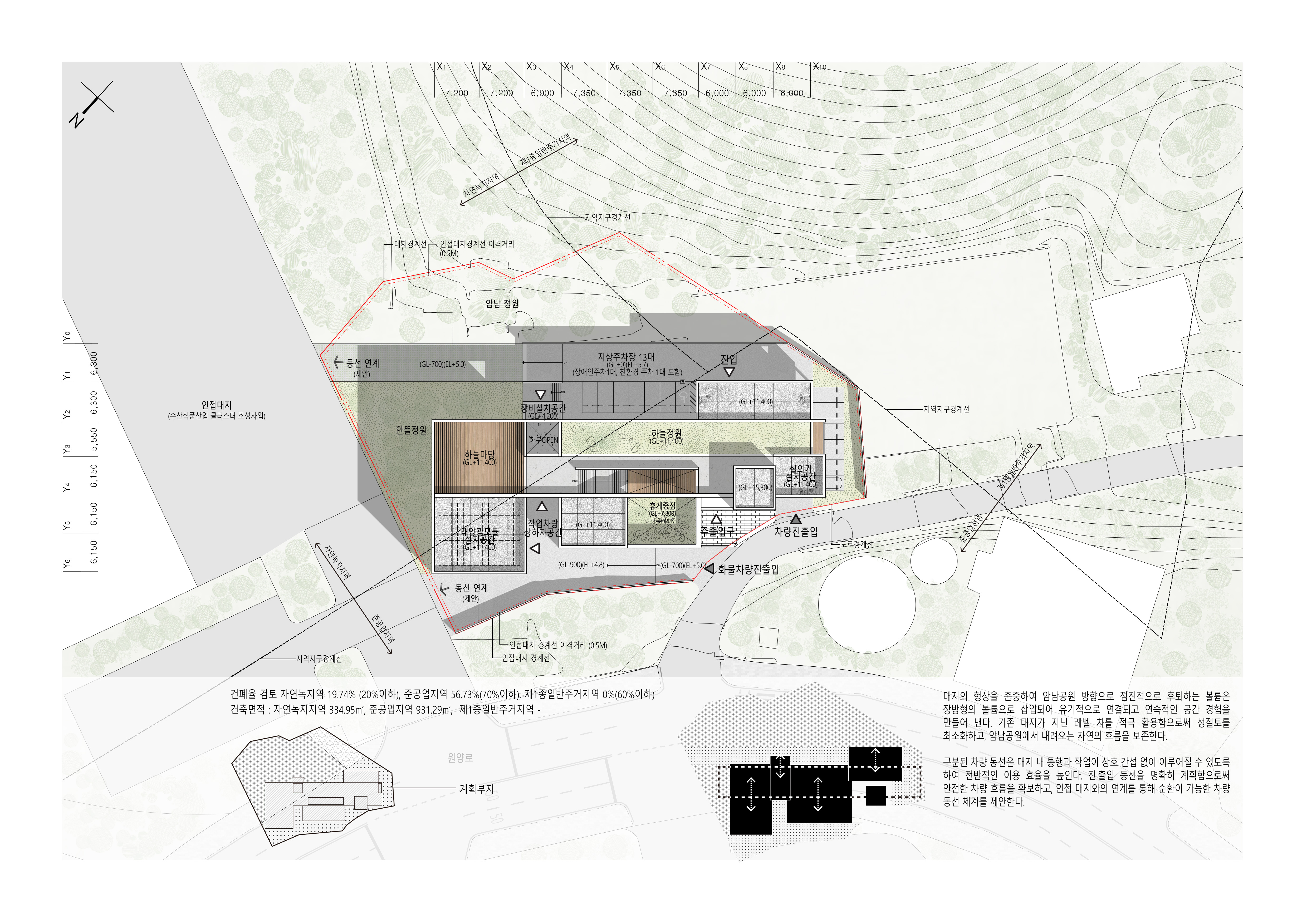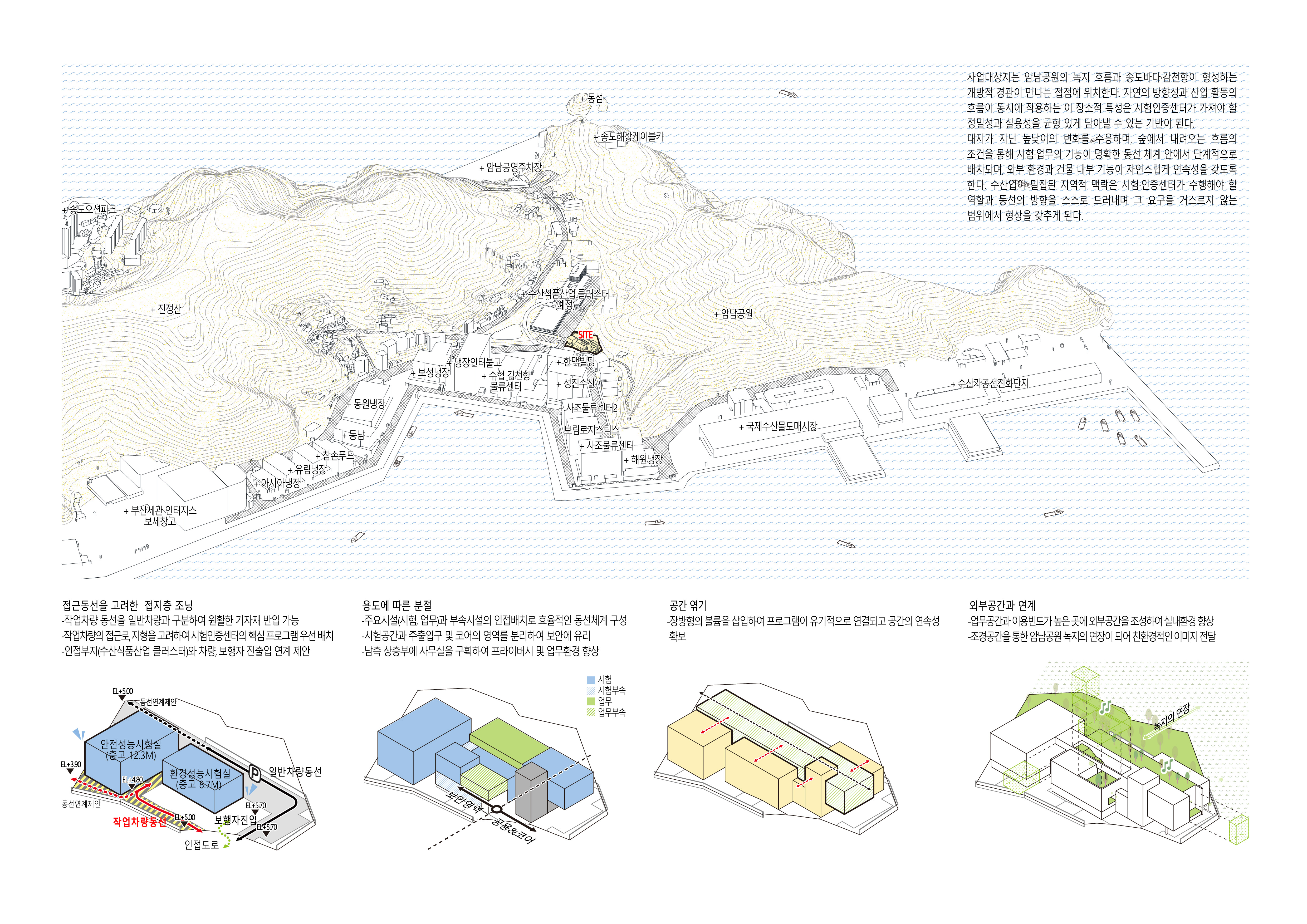 사업대상지는 암남공원의 녹지 흐름과 송도바다·감천항이 형성하는 개방적 경관이 만나는 접점에 위치한다. 자연의 방향성과 산업 활동의 흐름이 동시에 작용하는 이 장소적 특성은 시험인증센터가 가져야 할 정밀성과 실용성을 균형 있게 담아낼 수 있는 기반이 된다. 대지가 지닌 높낮이의 변화를 수용하며, 숲에서 내려오는 흐름의 조건을 통해 시험·업무의 기능이 명확한 동선 체계 안에서 단계적으로 배치되며, 외부 환경과 건물 내부 기능이 자연스럽게 연속성을 갖도록 한다. 수산업이 밀집된 지역적 맥락은 시험·인증센터가 수행해야 할 역할과 동선의 방향을 스스로 드러내며 그 요구를 거스르지 않는 범위에서 형상을 갖추게 된다.