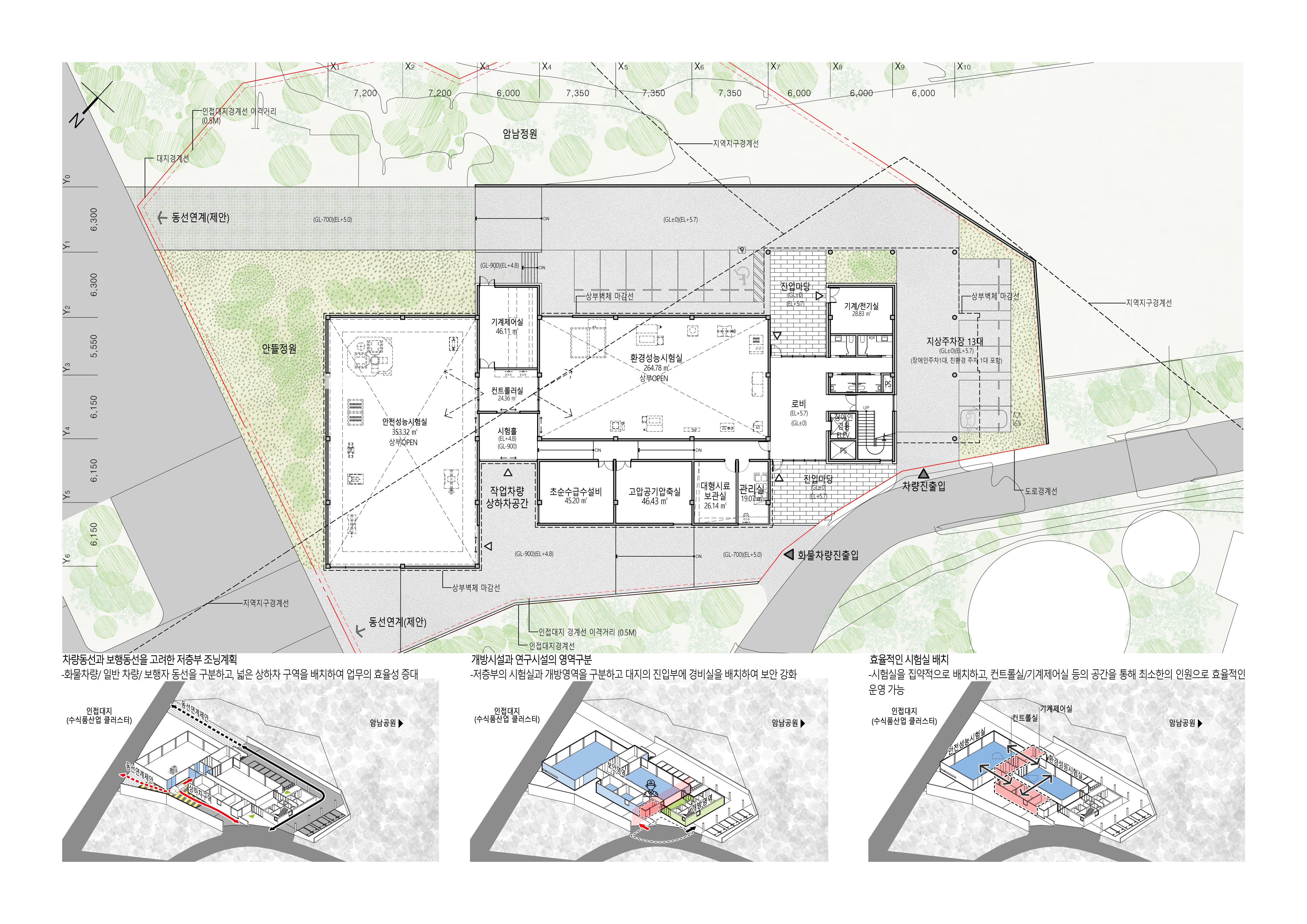 -. 안뜰정원, 암남정원 등 시험실 기능계획 외 외부공간 연계계획, 오픈 스페이스 계획 우수함. -. 일부 시험실 화물 하역 동선의 혼재 다소 아쉬움 -. 2층 시험실의 입체적 동선계획이 긴 복도를 지나는 등 다소 아쉬움.